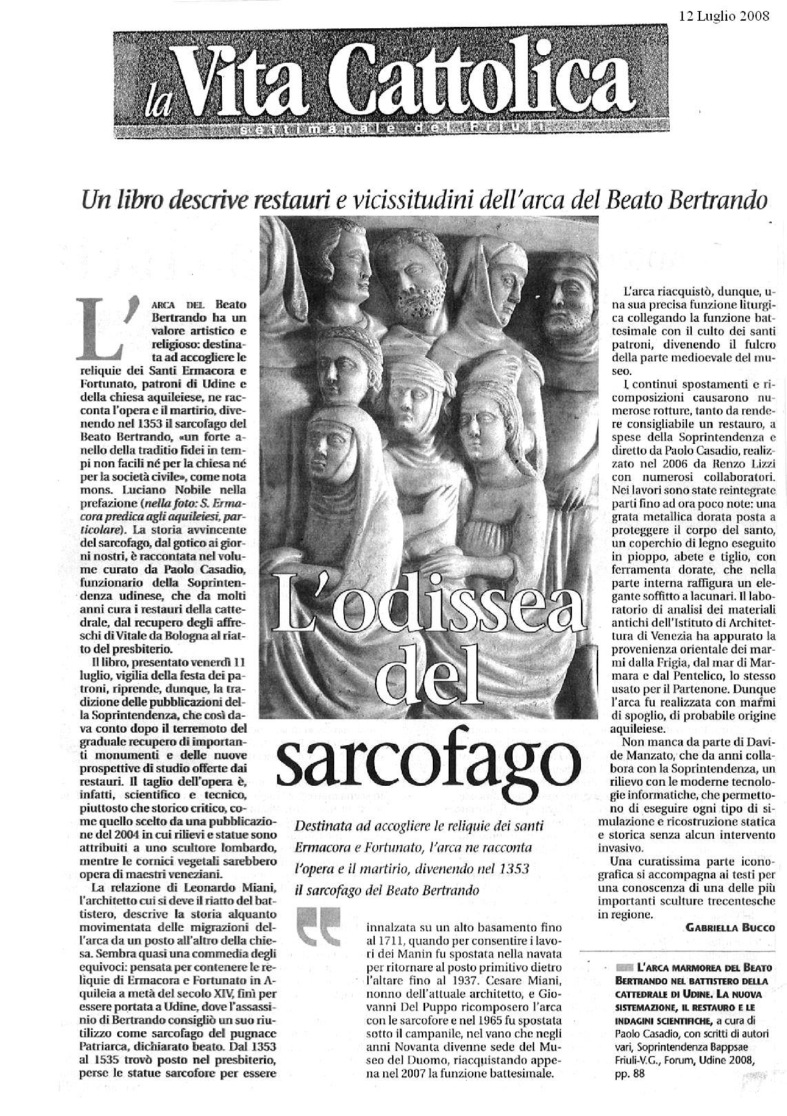 La pubblicazione documenta il restauro e le indagini scientifiche condotte, nel 2006, sull’arca marmorea trecentesca del Beato Bertrando, contestualmente alla sua nuova sistemazione nel battistero della cattedrale di Udine. Ripercorrendo la storia del monumento e delle sue vicende all’interno del duomo a partire dal 1353, il testo contribuisce a chiarire la genesi, il ruolo ed il significato del prezioso manufatto, per il quale vennero impiegati marmi antichi recuperati da monumenti romani.