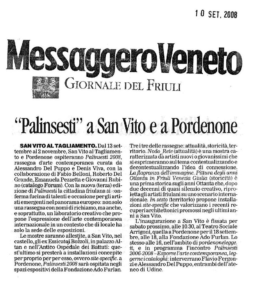 Il catalogo presenta le opere delle tre differenti mostre d’arte contemporanea organizzate nel 2008 a San Vito al Tagliamento e Pordenone. Nodo_Rete raccoglie opere e installazioni di alcuni giovani artisti italiani e internazionali intorno ad una polarità chiave della sensibilità contemporanea: la ‘rete’ e il ‘nodo’. Attraverso un percorso di confronti tra le diverse esperienze dell’arte delle ultime generazioni, la mostra ambisce a descrivere una delle strutture che definiscono, soprattutto dopo lo sviluppo di internet, le più disparate, e talora problematiche, forme di comunicazione. Un progetto di ricostruzione di carattere storico è, invece, La flagranza dell’immagine, il cui intento è quello di raccontare le vicende che hanno portato alcuni artisti friulani degli anni Ottanta a differenti forme di ritorno alla pittura figurativa, in linea con quanto, nel corso degli stessi anni, andava maturando a livello internazionale. In sesto, infine, si interroga sulla necessità di un discorso critico che sappia misurarsi con il problema del lungo periodo nella creatività di un artista attraverso il lavoro di tre autori di lunga e significativa esperienza, accomunati dalla continuità nella ricerca personale e da una fede tenace nelle ragioni del proprio linguaggio.