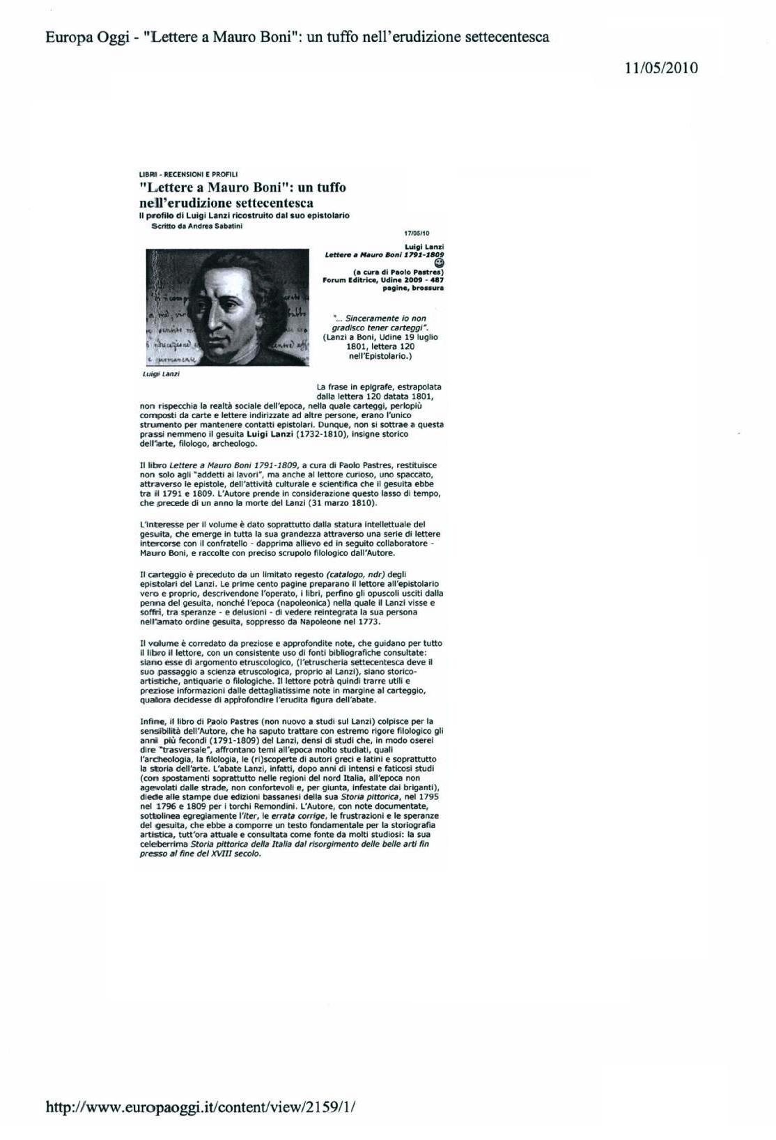 Tra il 1791 ed il 1809 l’abate Luigi Lanzi tenne un epistolario con il confratello, amico e collaboratore Mauro Boni. Nel carteggio dava conto, tra l’altro, degli studi da lui effettuati in quell’arco di tempo: l’abate consegnò infatti alle stampe le due edizioni bassanesi della Storia pittorica (1795-1796 e 1809), un testo fondamentale per la storiografia artistica, oltre a numerose opere di carattere antiquario e spirituale. Inoltre, nell’epistolario lanziano compaiono riferimenti alle maggiori personalità del mondo erudito a cavallo tra Sette e Ottocento, legate soprattutto all’ambiente veneto-friulano. Le missive del Lanzi sono qui raccolte e presentate per la prima volta, insieme ad alcuni saggi introduttivi. Un ricco commento critico aiuta a chiarire i passaggi più significativi e ad approfondire gli argomenti trattati, relativi soprattutto all’arte medievale.
