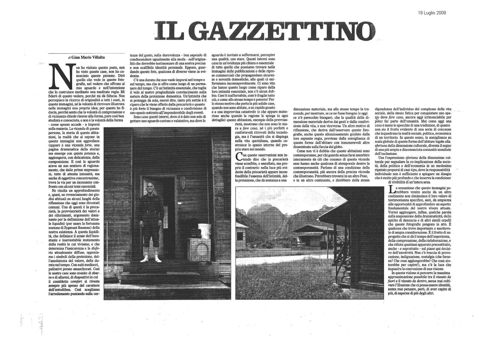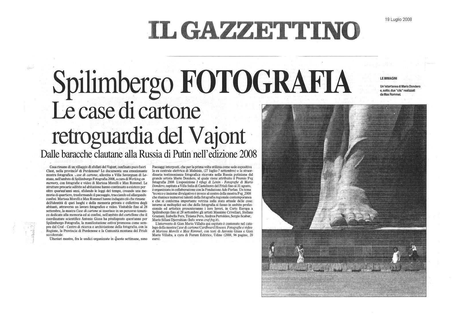 Alcuni giorni dopo il disastro del Vajont del 1963 il Comune di Claut, vicino a quello di Erto e Casso, destinò un’area per la sistemazione temporanea di una cinquantina di famiglie di sopravvissuti. Due generazioni di persone hanno fatto di questo ‘non luogo’ il ‘loro luogo’ e ci hanno abitato fino a poco tempo fa, quando il villaggio di prefabbricati, le ‘case di cartone’, è stato smantellato. Tutto questo viene raccontato dalle fotografie di questo volume che ritraggono le famiglie che si sono ricostruite un’identità nel villaggio, a dispetto della sua precarietà. «La vicenda di queste persone, la storia di queste abitazioni, la realtà che si espone in queste immagini non aggredisce (eppure è una vicenda ‘forte’, una pagina drammatica della storia) ma emerge con quieta potenza e, aggiungerei, con delicatezza, dalla composizione» (Gian Mario Villalta).