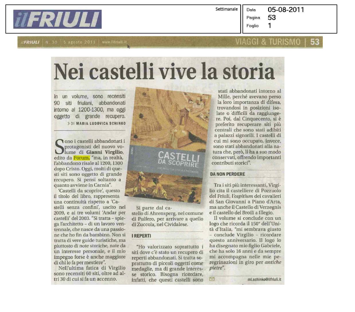 Castelli, castellieri e luoghi fortificati del Friuli Venezia Giulia. Ahrensperg / Andrazza (necropoli) / Attimis / Basagliapenta (torre campanaria) / Brazzano / Buja / Castelraimondo / Cergneu / Flagogna / Forni di Sopra (sito fortificato di Cuol di Ciastel) / Forni di Sotto (sito fortificato di Pra di Got) / Fusea (Cort dal Salvan) / Gradisca di Sedegliano (castelliere) / Gradisca di Spilimbergo (castelliere) / Grado (città murata) / Gronumbergo / Illegio (castello del Broili, pieve di San Floriano, Cjascjelat di Cuel di Tor, Cjascjelat di Feletèit) / Invillino / Lauco / Majano (hospitale di San Tomaso) / Malborghetto (Tabor) / Manzano / Marano (fortezza) / Meduno / Mizza / Moccò / Montereale / Piano D’Arta (ospitium dei cavalieri di San Giovanni) / Pinzano / Portis / Pozzuolo del Friuli (castelliere) / Raveo e sito archeologico sul monte Sorantri / Ravistagno / Sammardenchia (villaggio preistorico) / San Giovanni D’Antro (grotta fortificata) / Savorgnano del Torre (La Motta) / Sezza e pieve di San Pietro / Soffumbergo / Solimbergo / Tarcento / Tarvisio (chiesa fortificata) / Urusbergo (Uruspergo o Guspergo) / Tenzone (sistema difensivo: Montfort, Plovergno, Pragel, Satimberch, spalti di Santa Caterina, Rivellino Veneziano) / Verzegnis / Weissenfels / Zuccola.