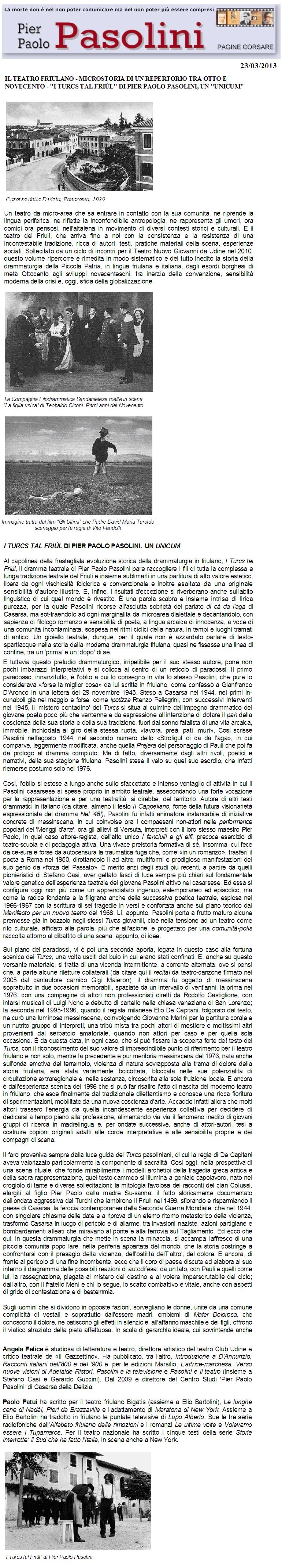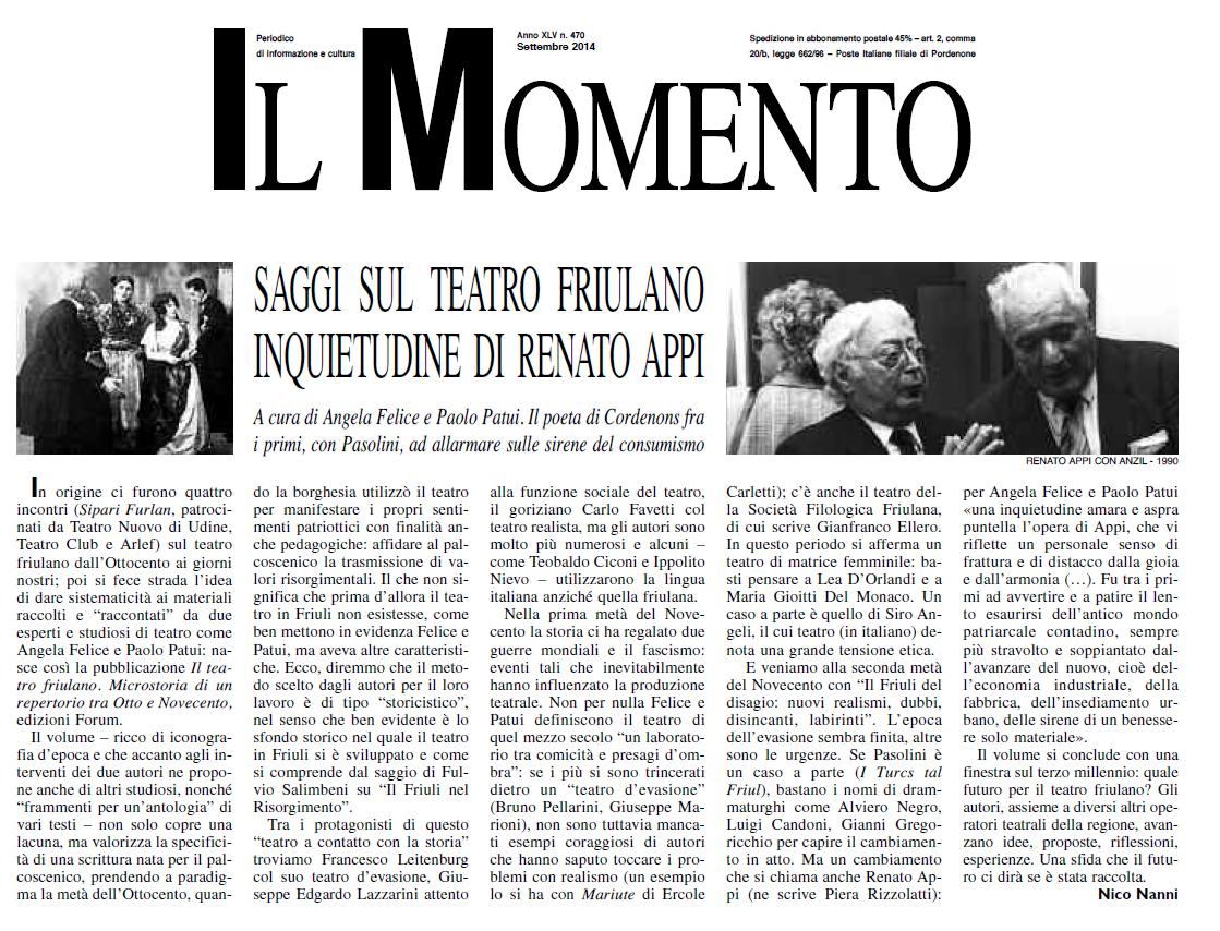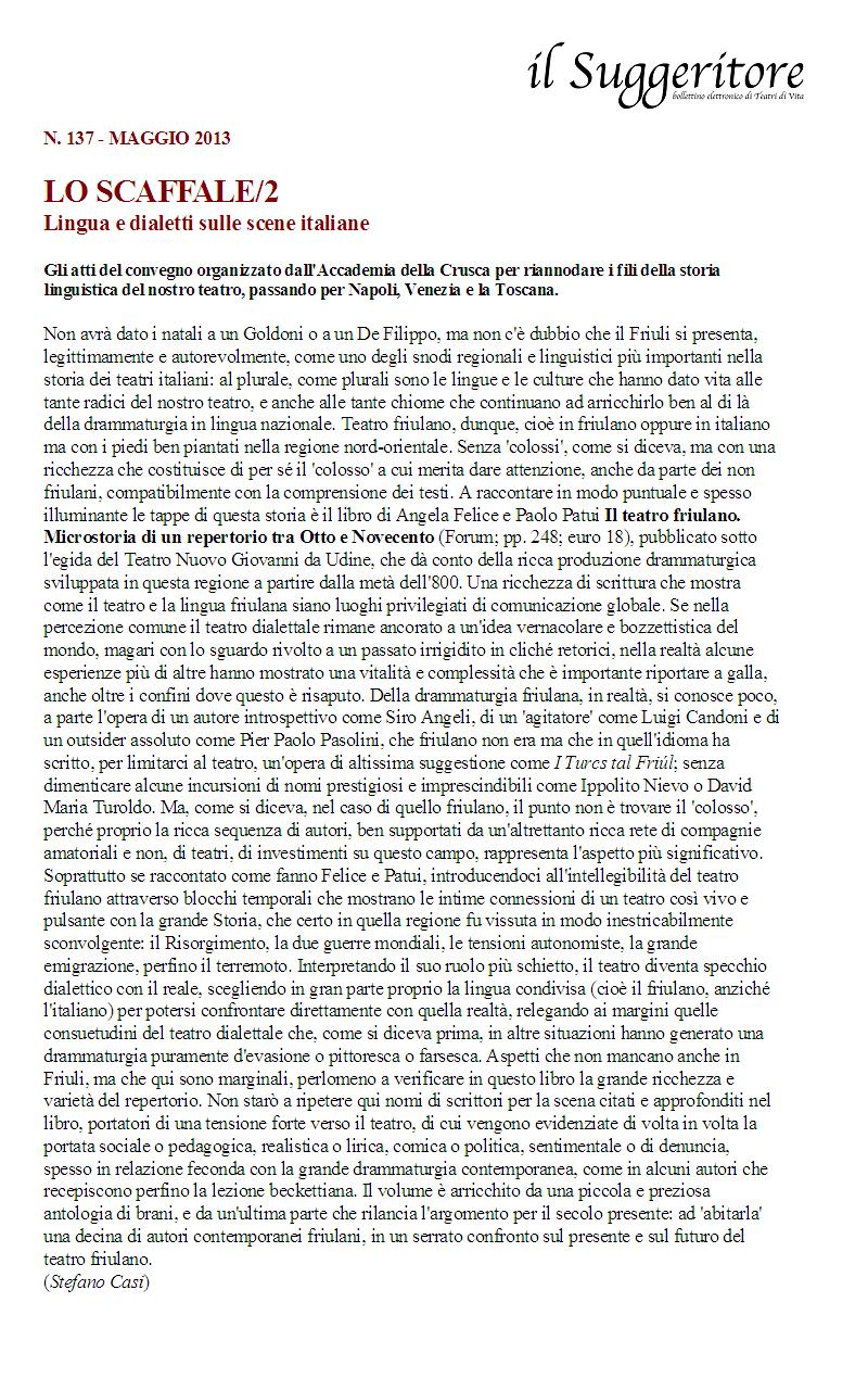Questo volume ripercorre e rimedita in modo sistematico e del tutto inedito la storia della drammaturgia della Piccola Patria, in lingua friulana e italiana, dagli esordi borghesi di metà Ottocento agli sviluppi novecenteschi, tra inerzia della convenzione, sensibilità moderna della crisi e, oggi, sfida della globalizzazione. Un teatro da micro-area che sa entrare in contatto con la sua comunità, ne riprende la lingua periferica, ne riflette l'inconfondibile antropologia, ne rappresenta gli umori, ora comici ora pensosi, nell'altalena in movimento di diversi contesti storici e culturali. É il teatro del Friuli, che arriva fino a noi con la consistenza e la resistenza di una incontestabile tradizione, ricca di autori, testi, pratiche materiali della scena, esperienze sociali.