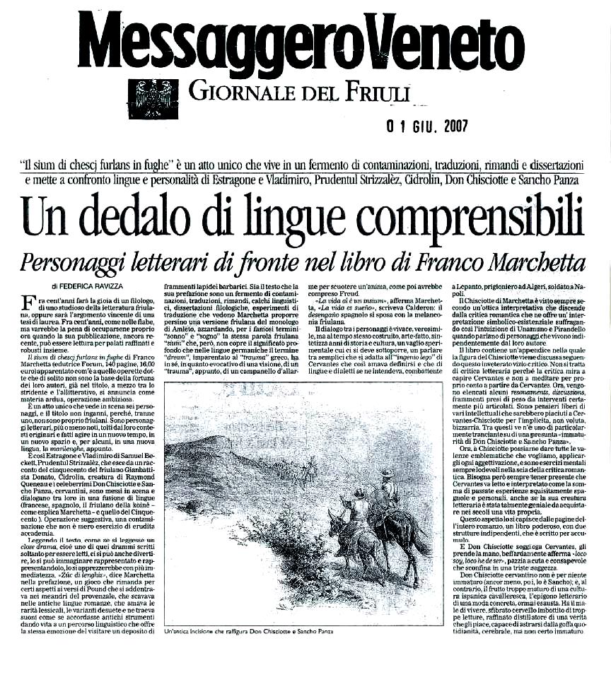 Il sogno di questi friulani fuggitivi è il tema di un saggio che si fa racconto di un’esperienza mai conclusa (la Farie di Maj, che nel 2002 ha coinvolto un’ottantina di artisti sul tema del Don Chisciotte) e divenuta simbolica della difficoltà di produrre cultura autonoma in Friuli. Fingendo di raccontare quell’esperienza, l’autore propone alcuni ragionamenti sull’immaginario collettivo friulano, sulla difficoltà di costruire il sogno e su una lingua che, per mancanza di interpreti e di consapevolezza, non ha saputo produrre un’epica. Condotta sul filo dell’ironia, l’opera si compone di tre parti: un saggio; un atto unico dimostrativo costruito con l’armamentario dei luoghi comuni friulani in un confronto con il francese di Queneau e lo spagnolo di Cervantes; infine un repertorio di contributi degli artisti che hanno lavorato alla Farie del 2002.