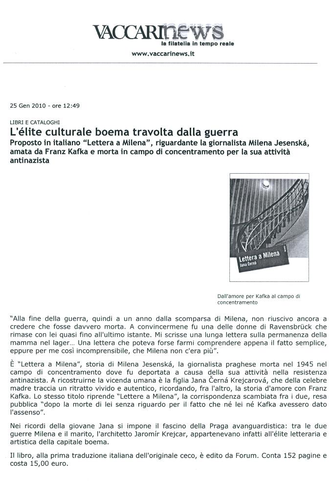 Il libro racconta la vita e il carattere di Milena Jesenská, la giornalista praghese morta nel 1944 nel campo di concentramento di Ravensbrück, dove fu deportata a causa della sua attività nella resistenza antinazista. L'intensa narrazione si deve alla penna di Jana Černá Krejcarová, la scapigliata figlia di Milena, che della celebre madre traccia un ritratto vivido e autentico, affrontando anche il tema della storia d’amore di Milena e Franz Kafka. Nei ricordi della giovane Jana si impone inoltre il fascino della Praga avanguardistica: tra le due guerre Milena e il marito, l’architetto Jaromír Krejcar, appartenevano infatti all’élite letteraria e artistica della capitale boema. È questa la prima traduzione italiana dell’originale ceco. Le fotografie del volume sono di Michaela Půlpánová.