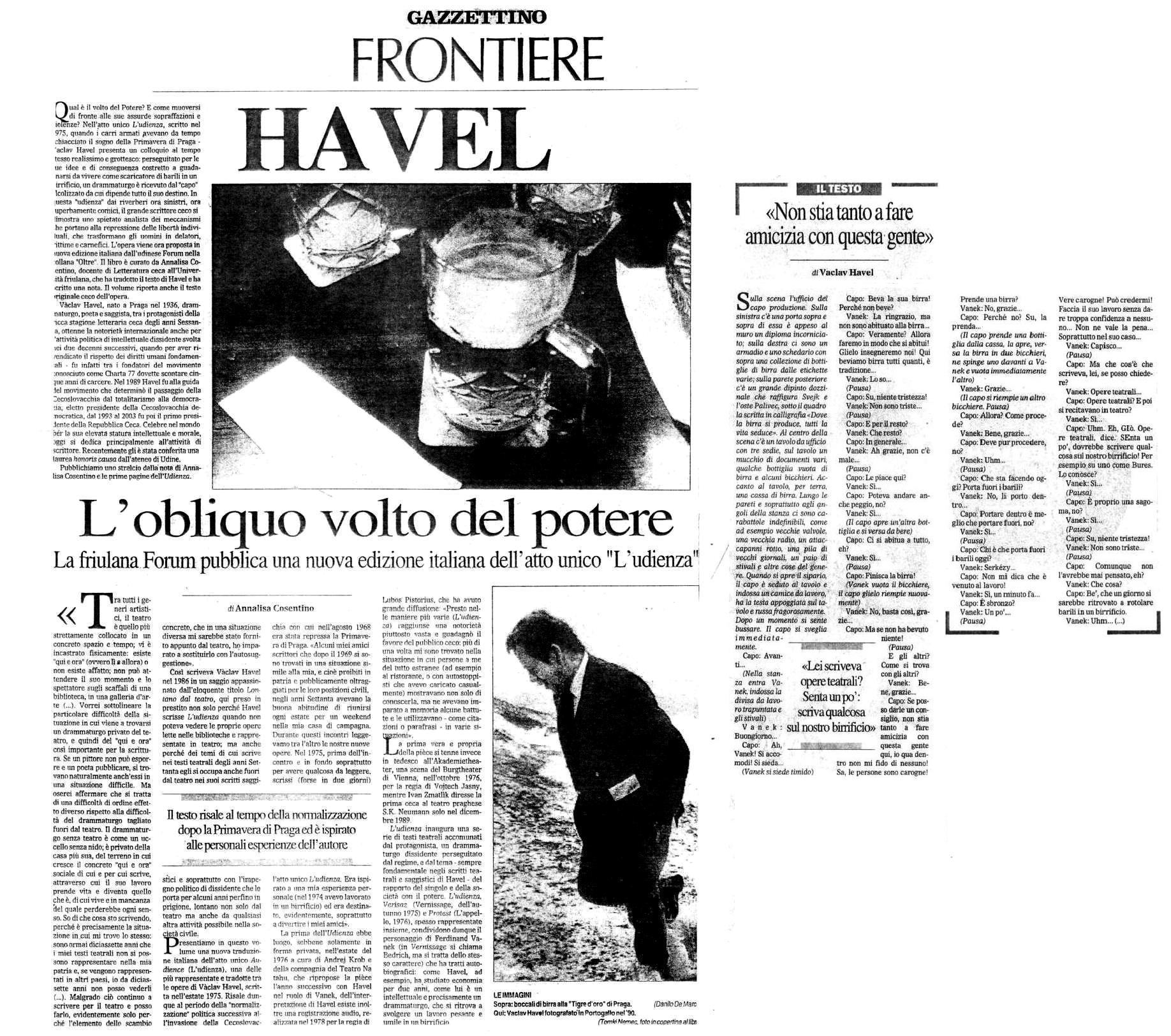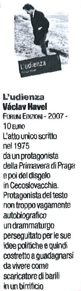 Qual è il volto del Potere? E come muoversi di fronte alle sue assurde sopraffazioni e violenze? Nell’atto unico L’udienza, scritto nel 1975 – quando i carri armati avevano da tempo schiacciato il sogno della Primavera di Praga – Václav Havel ci presenta un colloquio al tempo stesso realissimo e grottesco: perseguitato per le sue idee e di conseguenza costretto a guadagnarsi da vivere come scaricatore di barili in uno squallido birrificio, un drammaturgo è ricevuto dal «capo» alcolizzato da cui dipende tutto il suo destino. In questa «udienza» dai riverberi ora sinistri, ora superbamente comici, il grande scrittore ceco si dimostra uno spietato analista dei meccanismi che portano alla repressione delle libertà individuali, che trasformano gli uomini in delatori, vittime e carnefici. Il volume, che riporta il testo originale ceco dell’opera, ne propone una nuova traduzione italiana a cura di Annalisa Cosentino.