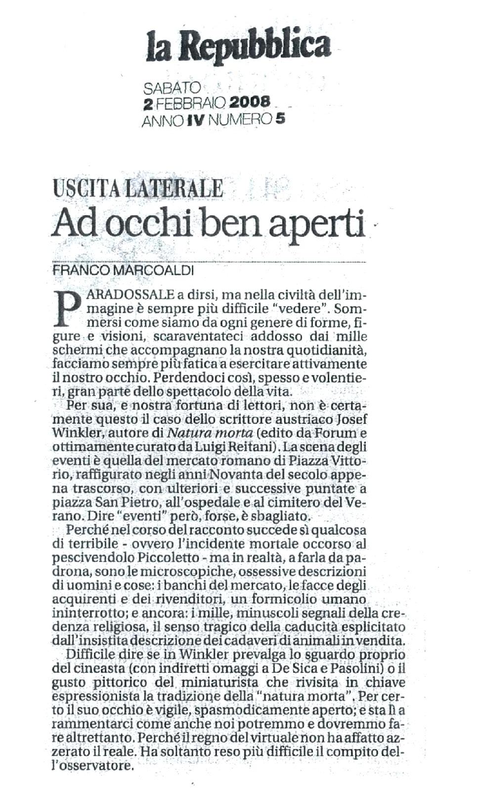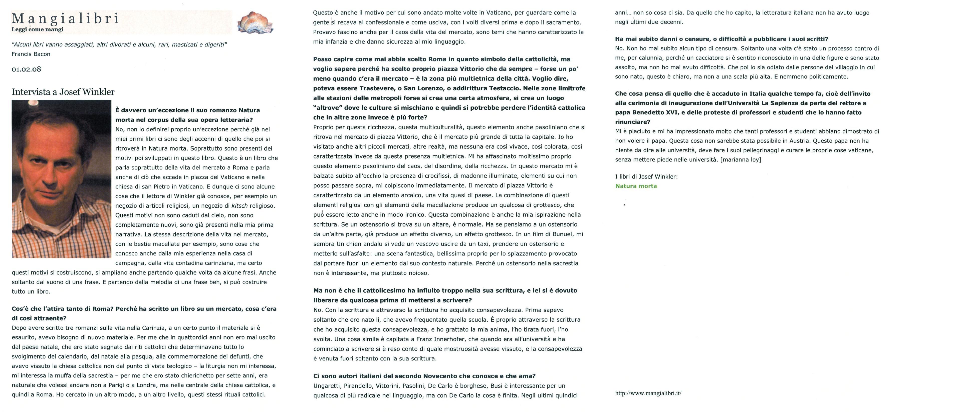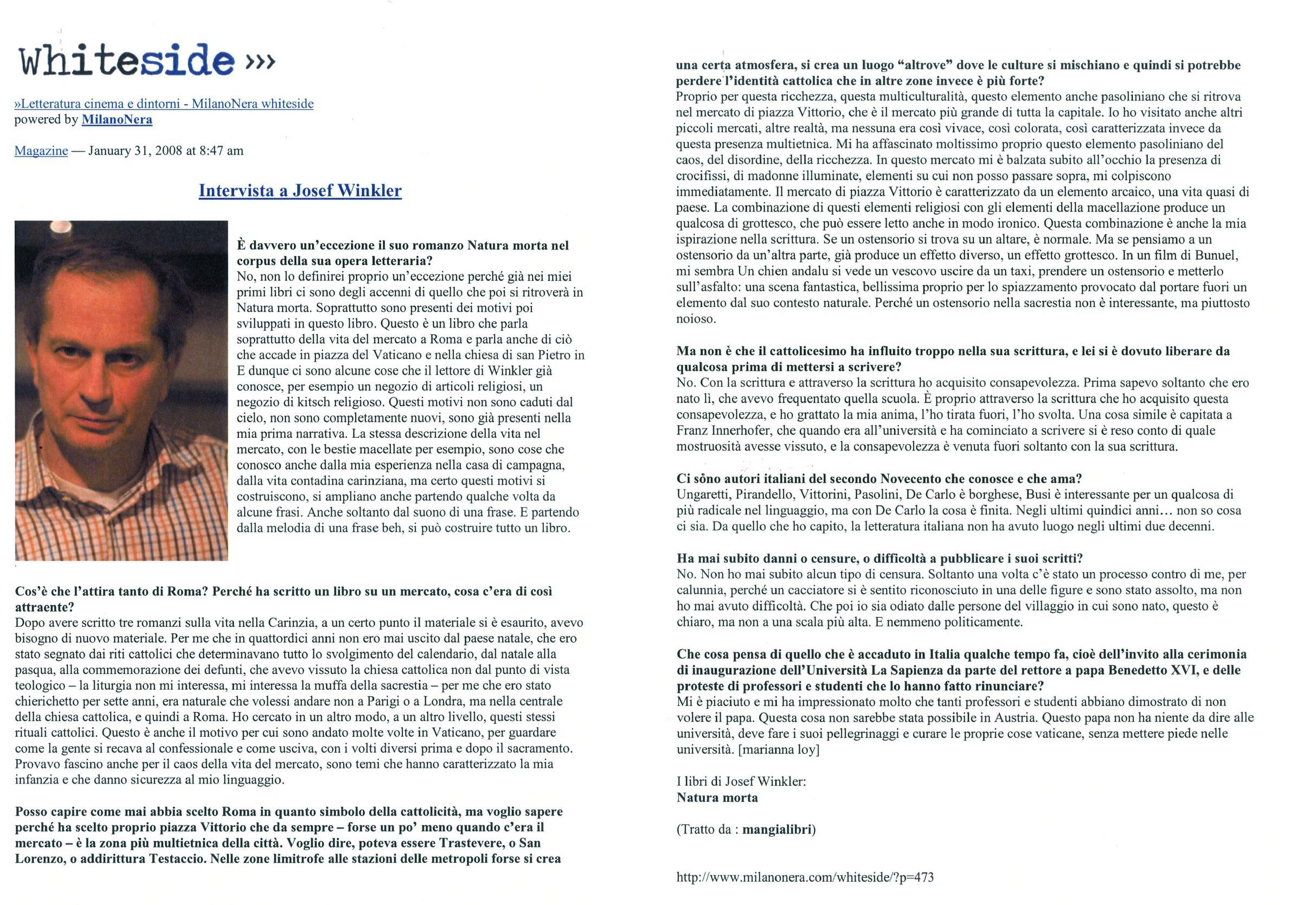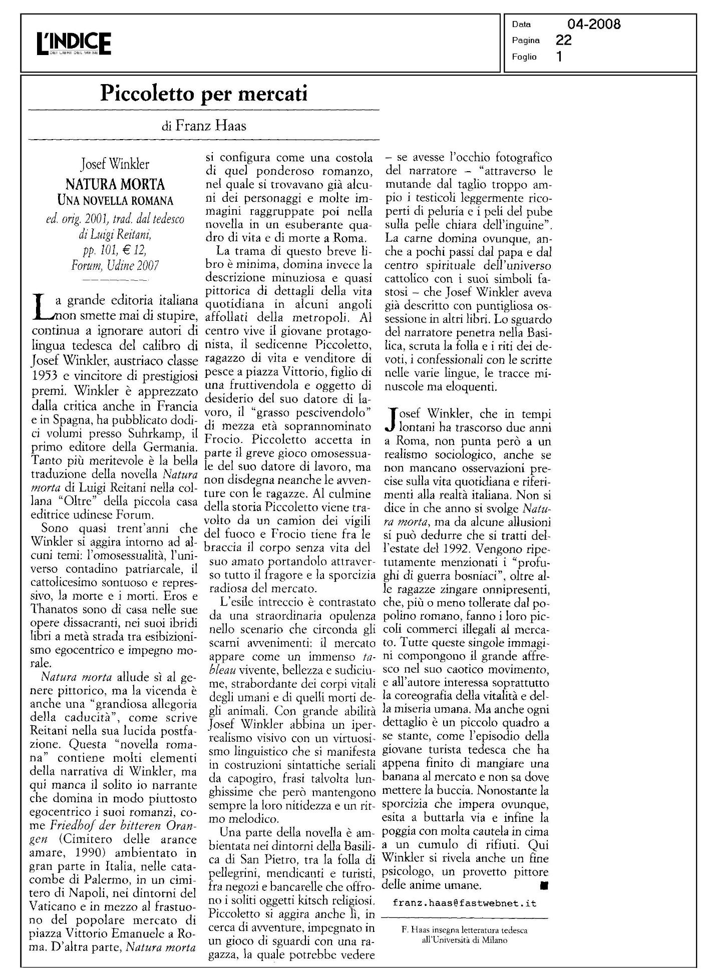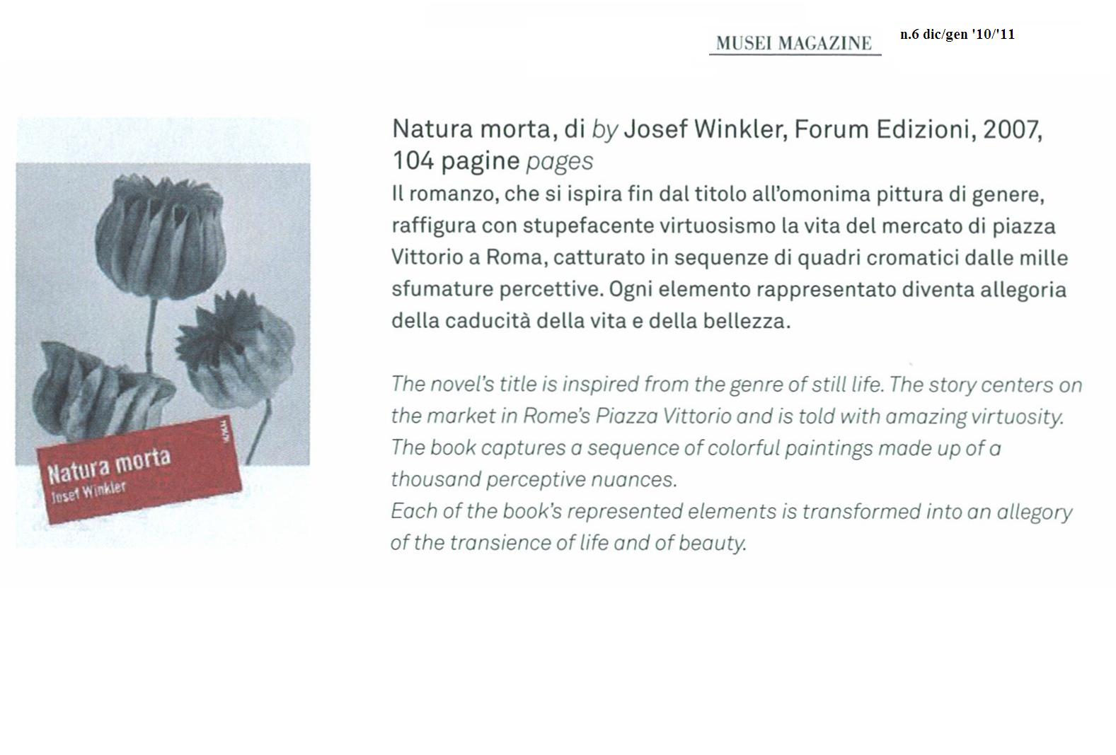 Crudo e straziante apologo sulla caducità della vita e della bellezza, il romanzo si ispira fin dal titolo all’omonima pittura di genere, raffigurando con stupefacente virtuosismo la vita del mercato di piazza Vittorio a Roma, catturato in una memorabile sequenza di quadri cromatici dalle mille sfumature percettive. Genius loci del mercato è Piccoletto, figlio di una fruttivendola che lavora al banco del pesce, novello Adone di una quotidianità che non sembra più conoscere la trascendenza e che riduce i simboli religiosi a vuoti oggetti di consumo. La sua tragica morte dà origine a una passionale liturgia collettiva, rappresentata con accenti al tempo stesso epici e visionari. Con questo racconto, prima sua opera tradotta in italiano, Josef Winkler ha ottenuto nel 2001 il prestigioso premio Döblin.