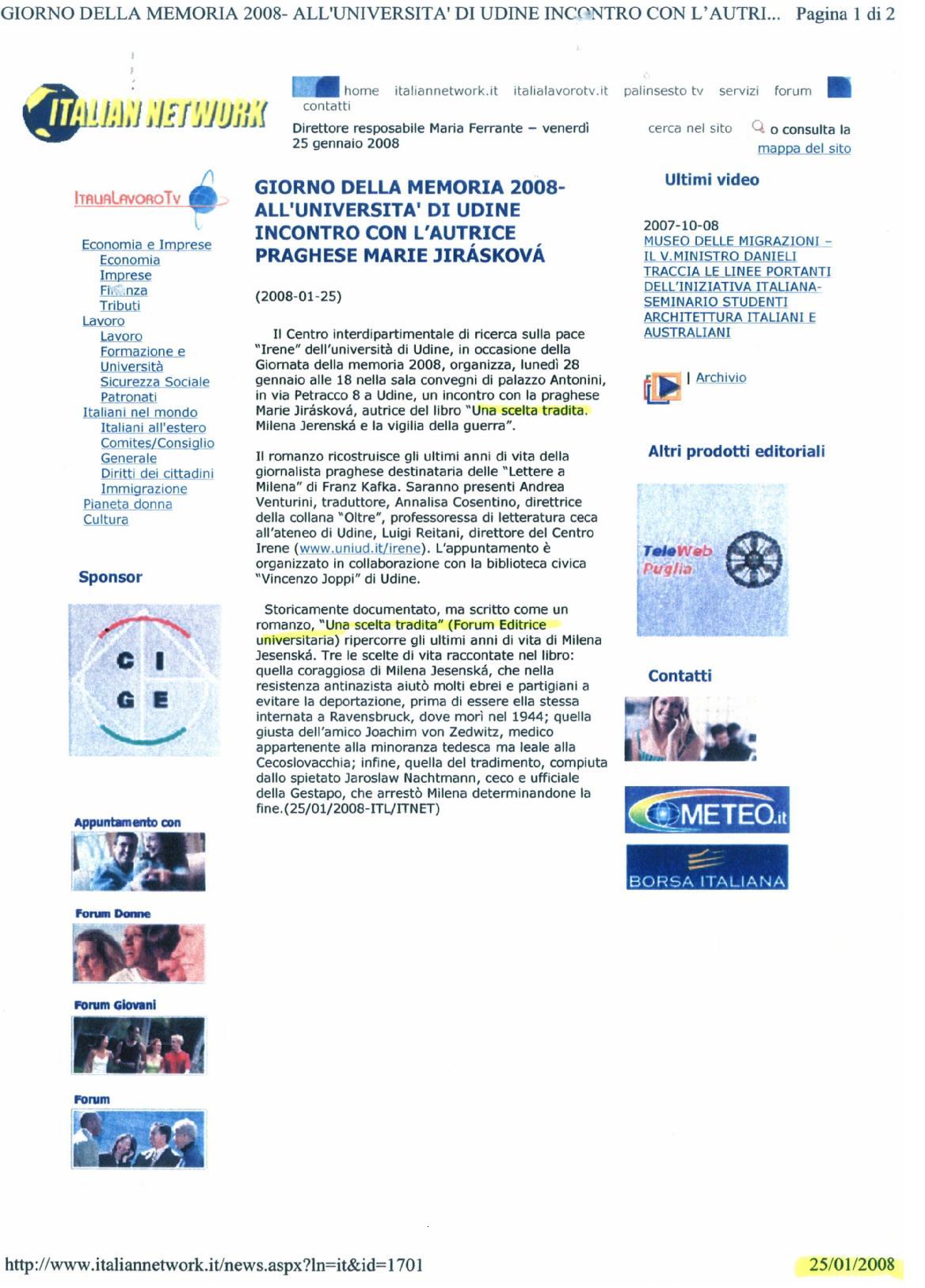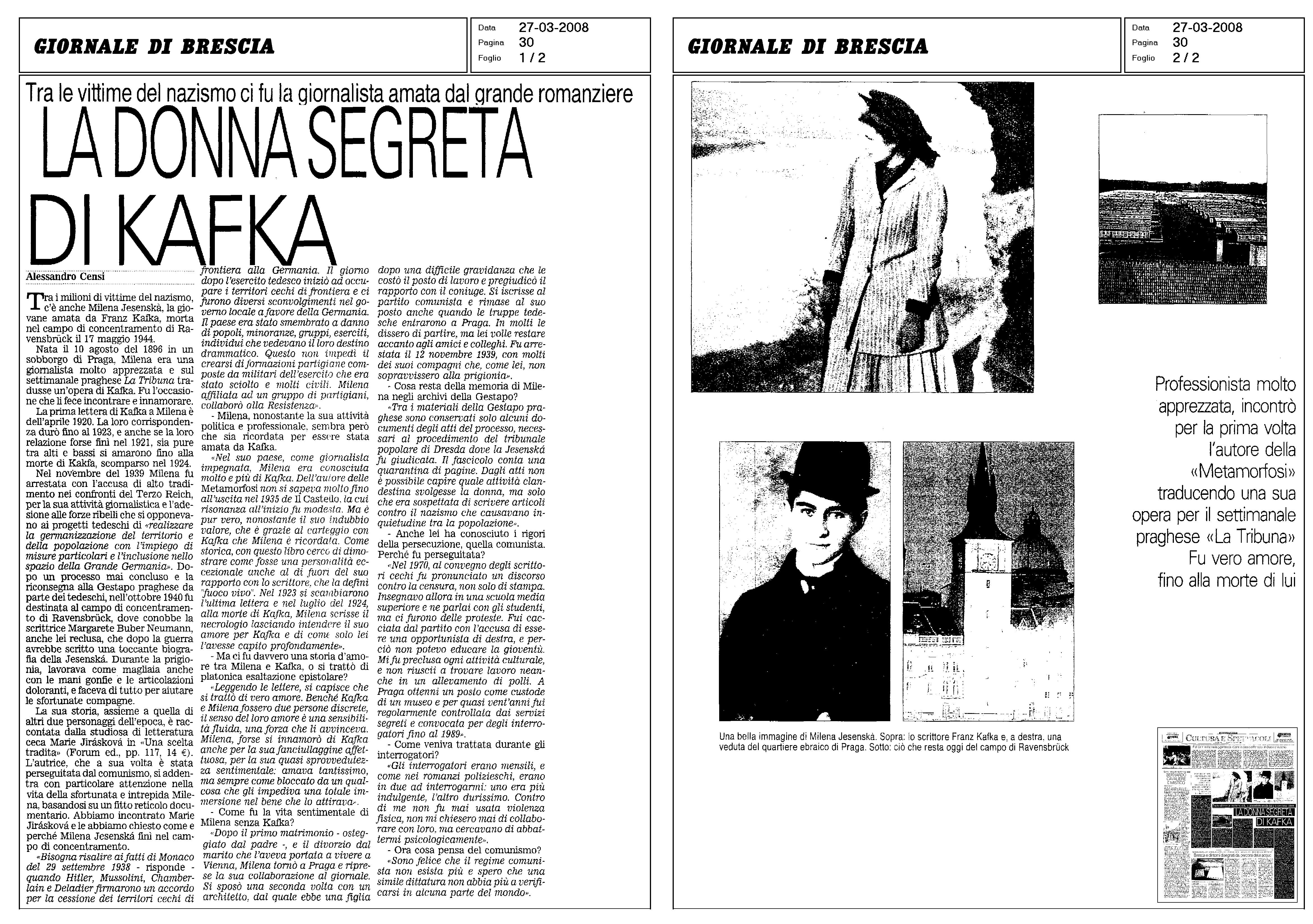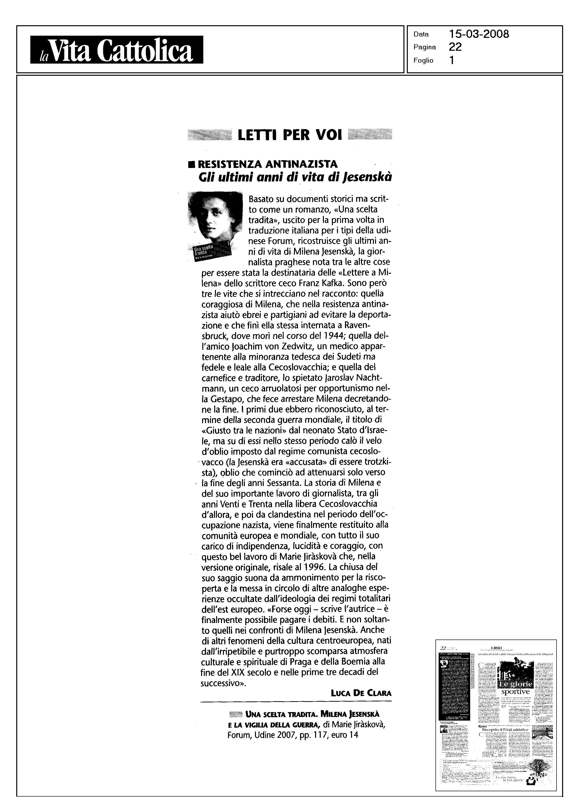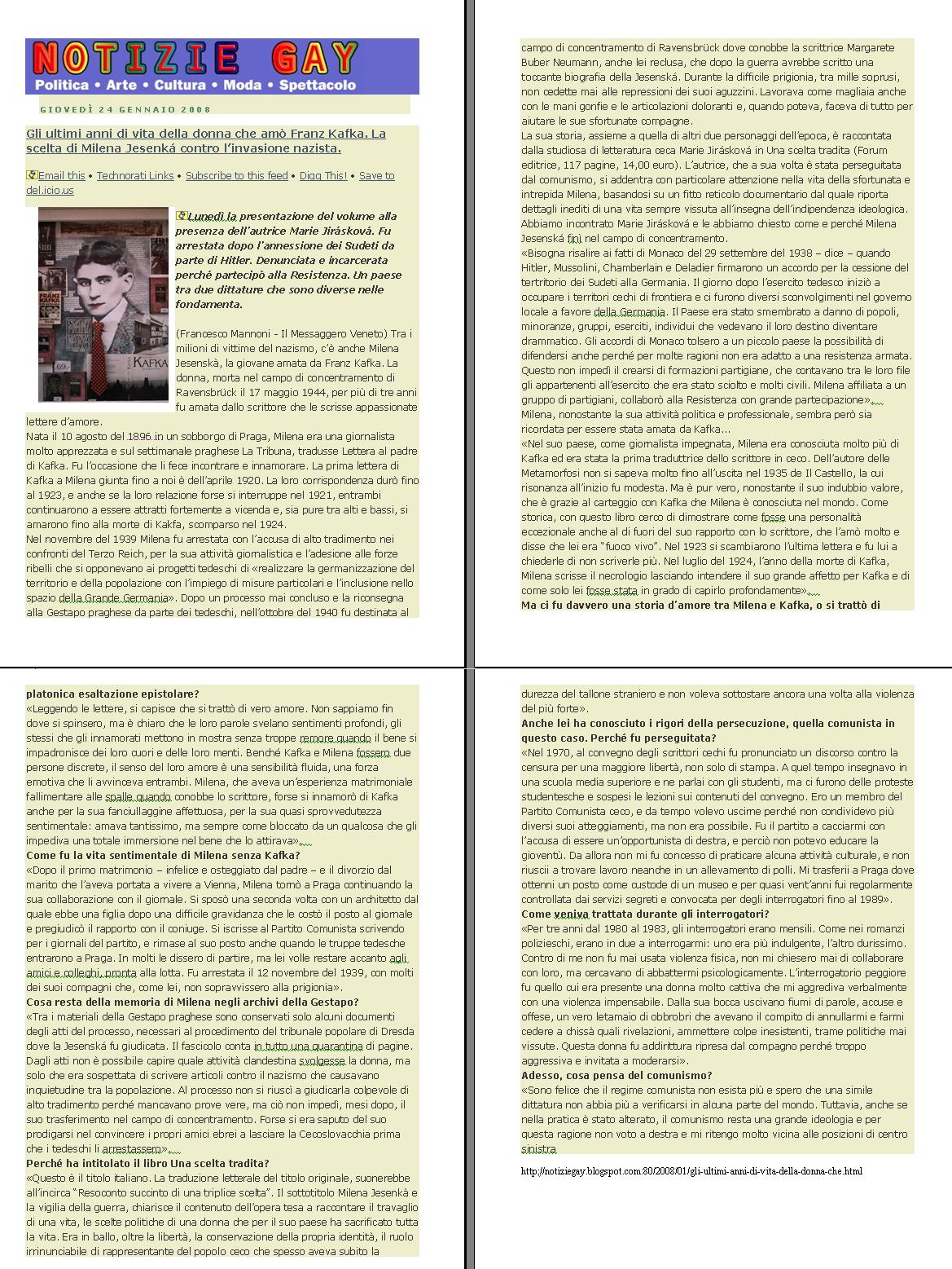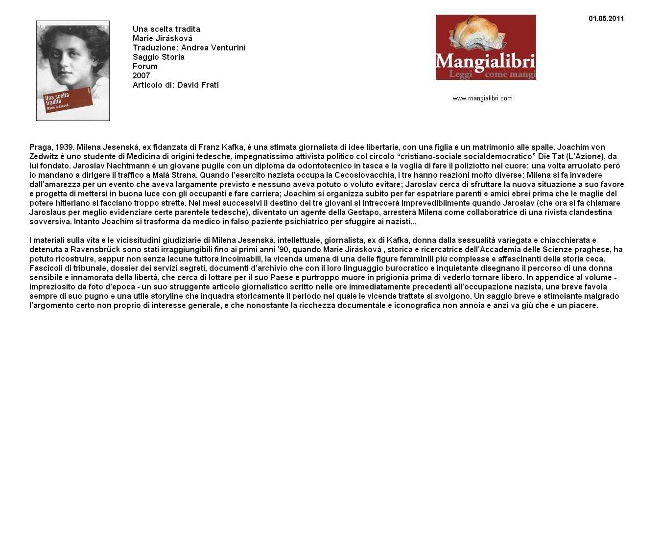 Basato su documenti storici ma scritto come un romanzo, il racconto ricostruisce gli ultimi anni di vita di Milena Jesenská, la giornalista praghese nota tra l’altro per essere stata la destinataria delle Lettere a Milena di Franz Kafka. Sono in effetti tre le scelte di vita raccontate nel libro: quella coraggiosa di Milena Jesenská, che nella resistenza antinazista aiutò molti ebrei e partigiani a evitare la deportazione, prima di essere ella stessa internata a Ravensbrϋck, dove morì nel 1944; quella giusta dell’amico Joachim von Zedwitz, un medico appartenente alla minoranza tedesca ma leale alla Cecoslovacchia; infine, quella del tradimento, compiuta dallo spietato Jaroslaw Nachtmann, ceco e ufficiale della Gestapo, che arrestò Milena determinando la sua fine. Il libro, corredato di riproduzioni di documenti e fotografie dell’epoca, contiene inoltre una dettagliata cronologia della vita di Milena Jesenská e due suoi scritti.