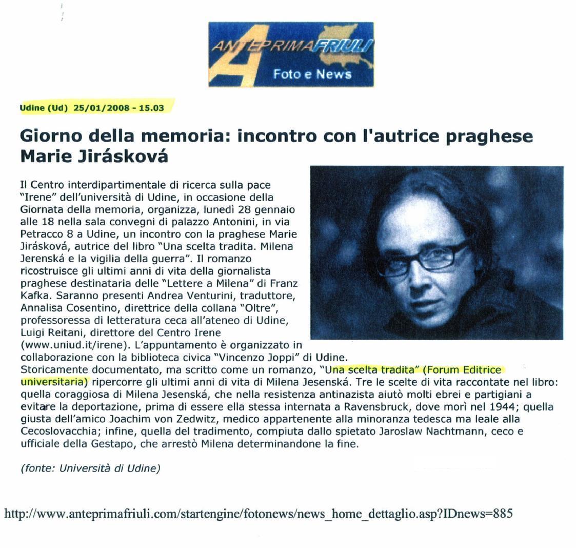 Basato su documenti storici ma scritto come un romanzo, il racconto ricostruisce gli ultimi anni di vita di Milena Jesenská, la giornalista praghese nota tra l’altro per essere stata la destinataria delle Lettere a Milena di Franz Kafka. Sono in effetti tre le scelte di vita raccontate nel libro: quella coraggiosa di Milena Jesenská, che nella resistenza antinazista aiutò molti ebrei e partigiani a evitare la deportazione, prima di essere ella stessa internata a Ravensbrϋck, dove morì nel 1944; quella giusta dell’amico Joachim von Zedwitz, un medico appartenente alla minoranza tedesca ma leale alla Cecoslovacchia; infine, quella del tradimento, compiuta dallo spietato Jaroslaw Nachtmann, ceco e ufficiale della Gestapo, che arrestò Milena determinando la sua fine. Il libro, corredato di riproduzioni di documenti e fotografie dell’epoca, contiene inoltre una dettagliata cronologia della vita di Milena Jesenská e due suoi scritti.
