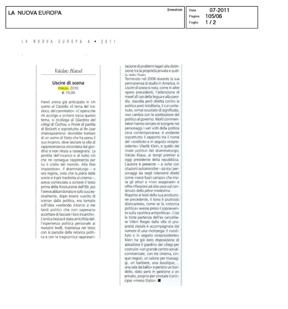 Con questa pièce del 2007, rappresentata con successo nel 2008 a Praga e a Londra, Václav Havel ritorna al mestiere di drammaturgo dopo la lunga pausa dovuta all’impegno di uomo politico e capo di Stato. Nell’opera, cadenzata da un ritmo ascendente, un politico di primo piano lascia la scena. L’azione si svolge su due livelli: la dinamica delle relazioni e della comunicazione tra le persone, uno dei temi prediletti nel teatro di Havel, viene rappresentata sia nell’ambito di politica e potere, sia su un piano più intimo e familiare. In scena la residenza che l’ex capo di governo deve lasciare, circondata dai ciliegi; nell’azione si intrecciano citazioni che rimandano al Giardino dei ciliegi di Čechov e a Re Lear di Shakespeare.