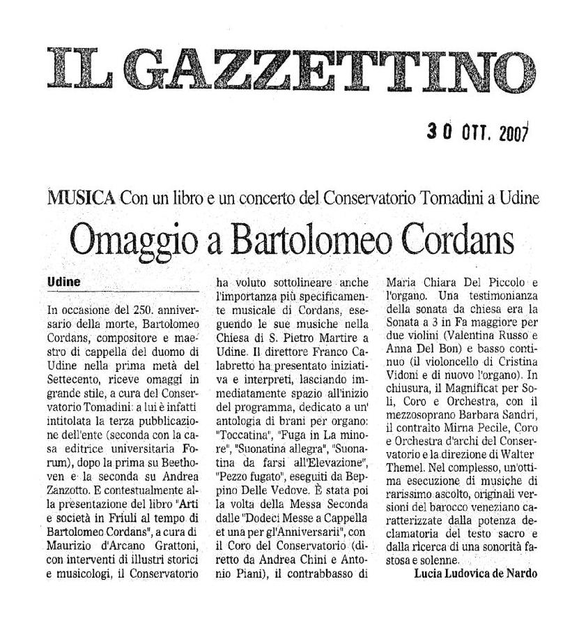 Il compositore Bartolomeo Cordans (Venezia, 1698 - Udine, 1757) fu senza dubbio la figura più significativa della musica friulana del Settecento e operò come maestro di cappella nel duomo udinese per oltre un ventennio, dal 1735 alla morte. Anni intensamente creativi durante i quali l’istituzione da lui diretta visse uno dei suoi periodi più ricchi e vitali. Il volume, oltre a puntualizzare numerosi aspetti biografici del musicista e a fornirne un approfondito inquadramento critico, illumina alcuni momenti – in parte del tutto inediti, in parte fino ad ora scarsamente indagati – della società friulana del tempo, che si mostra particolarmente vivace e aggiornata e capace di usufruire dei notevoli stimoli culturali e artistici provenienti dalla Dominante, senza peraltro dimenticare i possibili apporti delle vicine realtà oltralpine.