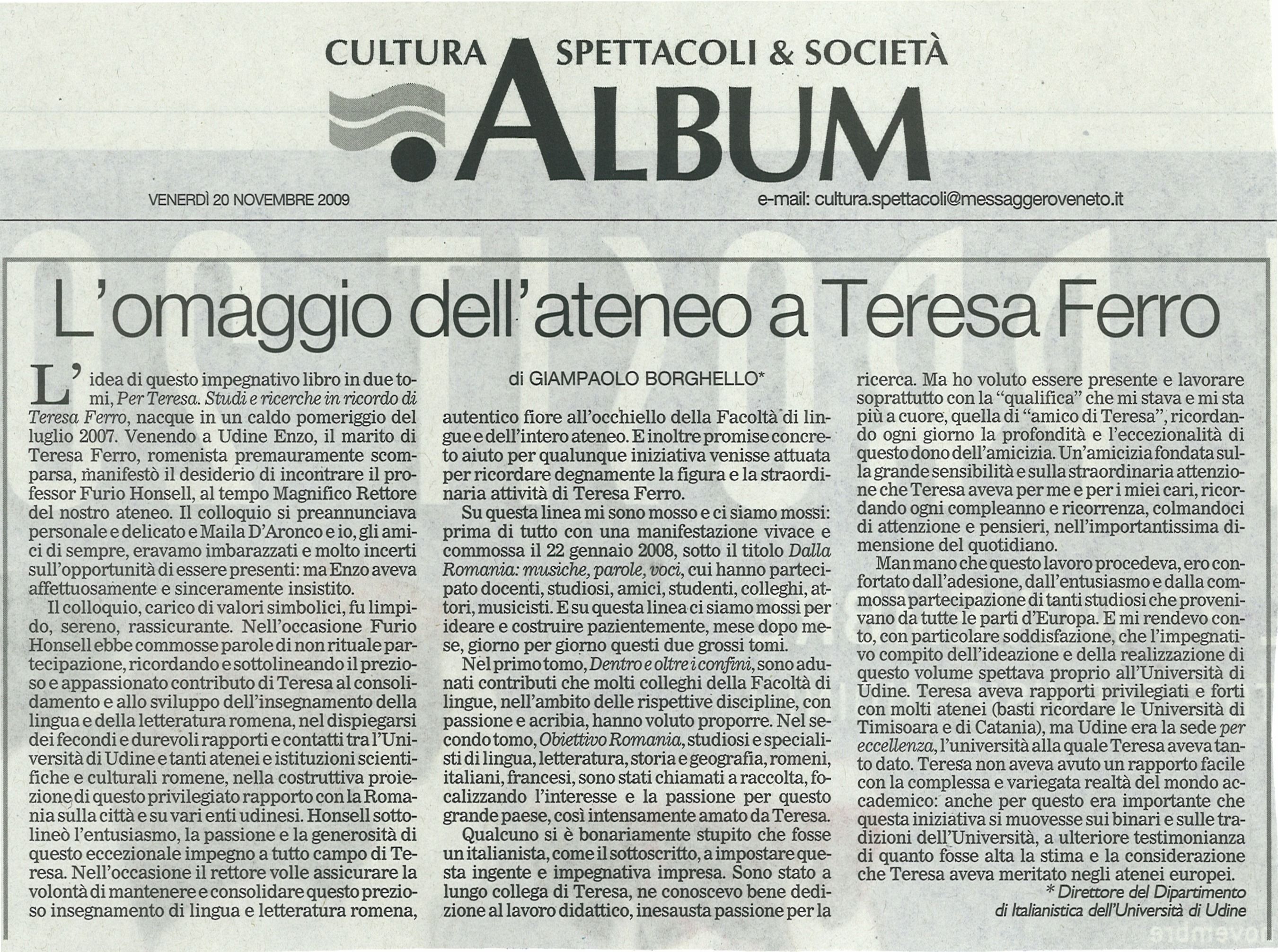 La pubblicazione, in due tomi, nasce con l’intento di onorare al meglio la memoria della professoressa Teresa Ferro (1956-2007), docente di Letteratura romena presso la Facoltà di Lingue e appassionata animatrice degli scambi e dei rapporti universitari e culturali tra Udine e le principali istituzioni romene. Il primo tomo raccoglie saggi di docenti della stessa Facoltà di Lingue impegnati in studi e ricerche che spaziano dalla letteratura italiana alla linguistica, dalla storia alla geografia, dalla letteratura inglese a quella spagnola. Nel secondo tomo sono stati riuniti i contributi di una cinquantina di autorevoli studiosi di lingua, storia, geografia e letteratura romene, sparsi in Romania, in Italia, in Belgio..., sulla storia, le tradizioni e la realtà di questo affascinante paese.