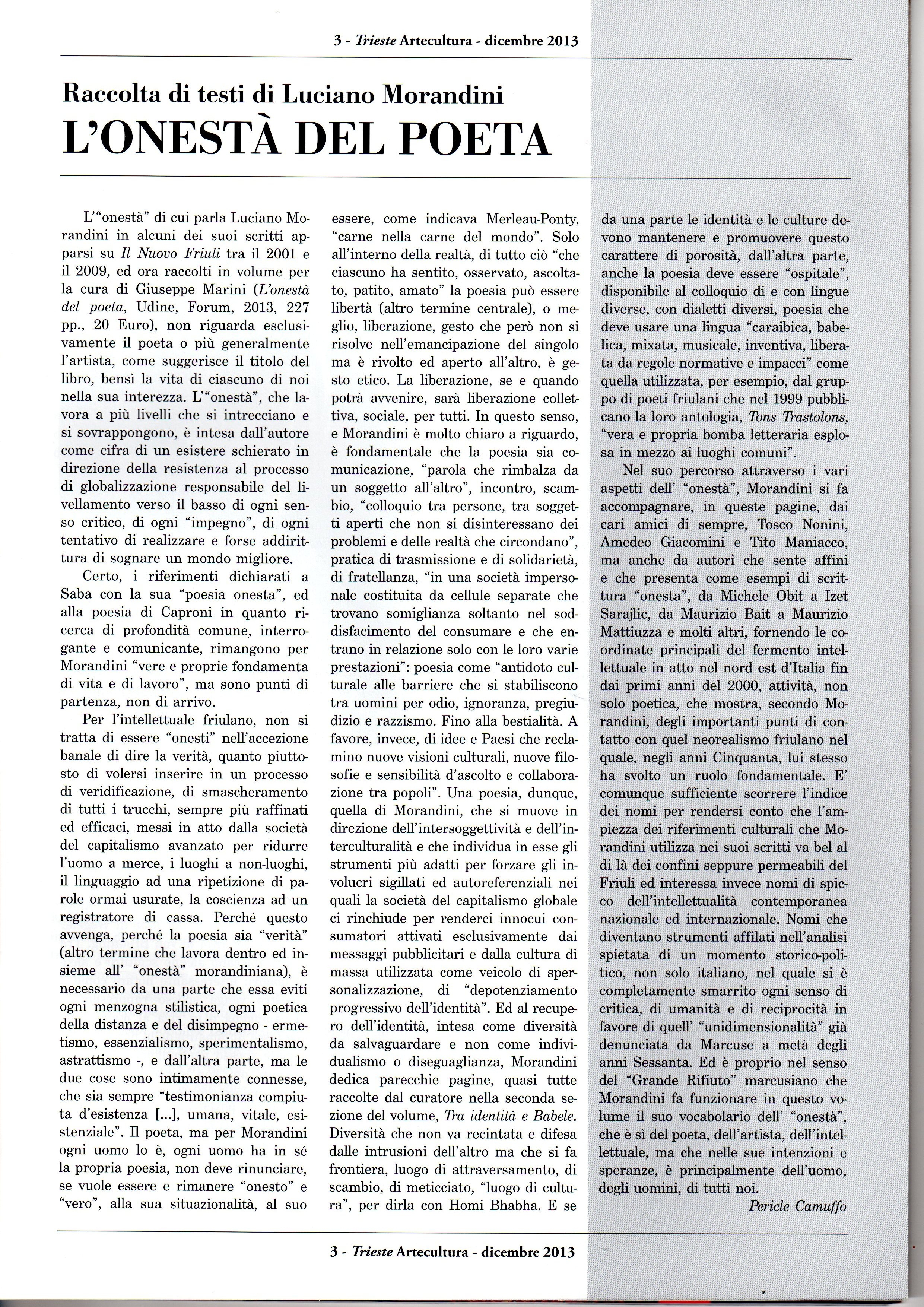 Luciano Morandini (1928-2009) è stato uno dei più importanti poeti e scrittori contemporanei friulani del secondo dopoguerra. Formatosi nella cultura politica della Liberazione, dai primi anni Cinquanta si pose alla ricerca di una lingua originale, innestando criticamente la sua esperienza umana e poetica nel solco del neorealismo. La sua produzione si dispiegò nei decenni seguenti in molteplici e originali forme, raggiungendo nel 1984 il vertice narrativo di San Giorgio e il drago. Gli ultimi anni della sua vita furono scanditi da opere poetiche sempre più scabre ed essenziali, talvolta visionarie, e ispirate a una disincantata e amara indignazione civile. Questo volume contiene una selezione degli oltre trecento articoli che Luciano Morandini pubblicò tra il 2001 e il 2009 sulla rivista «Il Nuovo Friuli», trattando di attualità politica, iniziative culturali, mostre d'arte, ma soprattutto di letteratura e poesia. In quegli scritti Morandini profuse un impegno instancabile - sollecitato dall'assillo quotidiano di un mondo involgarito, mercificato e dimentico dei valori fondativi delle repubblica democratica - nella difesa del lavoro poetico come espressione della ‘persona’ e scavo di verità, in uno con la rivendicazione della sabiana «onestà del poeta».
