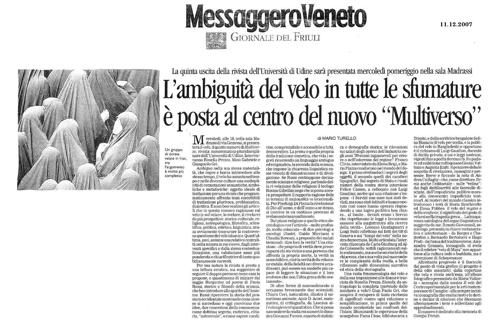 Cos’è il velo? cosa vuol dire velare? e svelare? La verità è aletheia, svelamento, le religioni si pensano come ri-velate e la scienza tenta di svelare i misteri di questo mondo. Ma togliere il velo implica anche violenza, l’informazione molte volte nasconde mentre dice di scoprire e l’esibizione ostentata può essere più imperscrutabile del pudore. Il velo, a differenza della maschera che tutto copre, si colloca nella dimensione intermedia delle trasparenze, delle sfumature, schermo e interfaccia del guardare e dell’essere guardato, labile confine fra il dentro e il fuori.