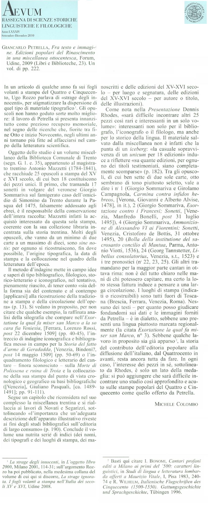 Giancarlo Petrella insegna Bibliologia presso l’Università Cattolica di Milano. Si è occupato di letteratura geografico-antiquaria fra Medioevo e Rinascimento (L’officina del geografo. La Descrittione di tutta Italia di Leandro Alberti e gli studio geografico-antiquari tra Quattro e Cinquecento, Milano, Vita e Pensiero, 2004) e di storia del libro, con particolare riguardo alla produzione e circolazione del libro a stampa fra Quattro e Cinquecento (Itinera Sarda. Percorsi fra i libri del Quattro e Cinquecento in Sardegna, a cura di G. Petrella, Cagliari, Cuec, 2004; Arnaldo Segarizzi storico, filologo, bibliotecario. Una raccolta di saggi, Trento, Provincia Autonoma, 2004; Uomini, torchi e libri nel Rinascimento, Udine, Forum, 2007). Nel 2004, in occasione del VII centenario petrarchesco, ha curato le esposizioni tenutesi presso la Biblioteca Trivulziana e la Biblioteca in via del Senato (‘Libri mei peculiares’. Petrarca e le sue letture nella Biblioteca in via del Senato, Milano, Biblioteca di via Senato Edizioni, 2005; Il Fondo Petrarchesco della Biblioteca Trivulziana. Manoscritti ed edizioni a stampa: sec. XIV-XX, a cura di G. Petrella, Milano, Vita e Pensiero, 2006).