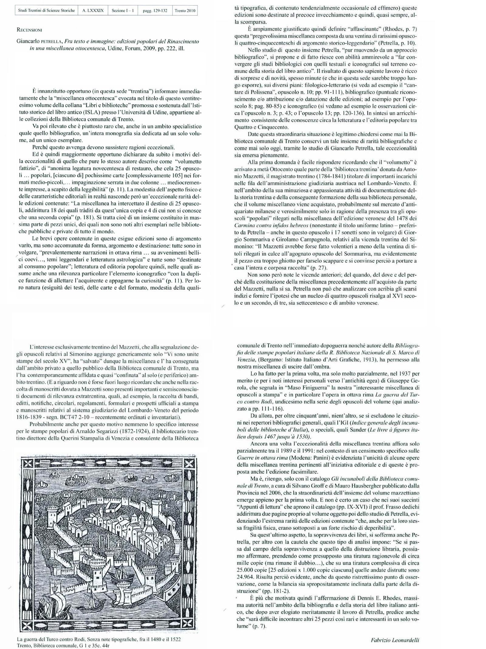 Il volume presenta un’analisi ampia e dettagliata di una miscellanea conservata presso la Biblioteca comunale di Trento e delle stampe in essa contenute, nella quale, pur movendo da un approccio bibliografico, gli studi bibliologici convergono con quelli testuali e iconografici sul terreno comune della storia del libro antico. Una miscellanea pressoché inesplorata, passata distrattamente anche fra le mani del suo proprietario, il giudice Antonio Mazzetti, che nel primo Ottocento l’acquistò sul mercato antiquario forse perché attratto dal primo degli opuscoli rilegati, riguardante il martirio del piccolo Simonino da Trento. Il volumetto si rivela invece una straordinaria raccolta di 25 rarissime stampe popolari del Rinascimento – una ventina delle quali non altrimenti note – di argomento profano: narrazioni in ottava rima sugli avvenimenti bellici coevi (la spedizione di Carlo VIII, la guerra della Lega di Cambrai, il sacco di Roma, la guerra col Turco), temi leggendari (l’Historia del re Vespasiano e un cantare di materia troiana sulla morte di Polissena finora sconosciuto), letteratura astrologica. Rivolti al rapido e convulso consumo popolare, tali libretti erano destinati a un inevitabile deperimento che giustifica l’assoluta esiguità delle copie conservate.