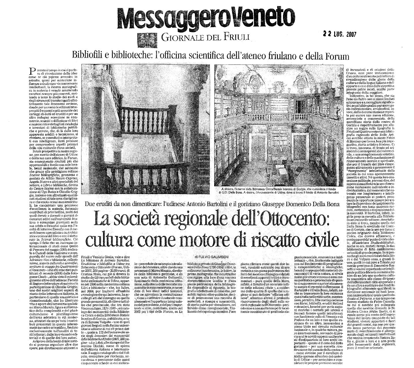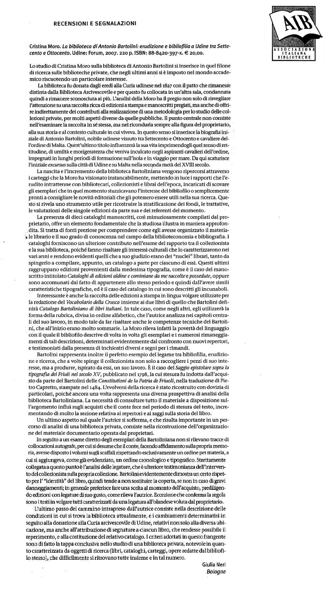 Il volume ricostruisce la storia della lenta costituzione della Biblioteca Bartoliniana di Udine, istituzione collocata, in seguito a donazione, nel Palazzo Arcivescovile e creata dal conte Antonio Bartolini, commendatore dell’Ordine dei cavalieri di Malta vissuto tra la seconda metà del Settecento e il primo quarto del secolo successivo. Si tratta di una biblioteca che rispecchia pienamente i gusti e gli orientamenti culturali del suo fondatore: trattandosi di una raccolta messa insieme da un bibliofilo, essa conserva edizioni di notevole rilievo storico e bibliografico. Il costante riferimento di questa ricerca a fonti documentarie di prima mano, le cui fondamenta si basano sull’analisi dell’epistolario del conte Bartolini, ha consentito di ricostruire vere e proprie fasi evolutive del suo collezionismo e interessi, e di penetrare la complessa e affascinante rete di contatti eruditi che egli costituì nel corso della sua vita. Emerge così il ritratto di un personaggio di notevole spessore culturale, un bibliofilo con una punta – come egli stesso ebbe modo di ammettere – di ‘bibliomania’ che ha lasciato in eredità alla sua città uno scrigno colmo di preziosità bibliografiche che attendono di essere adeguatamente valorizzate.