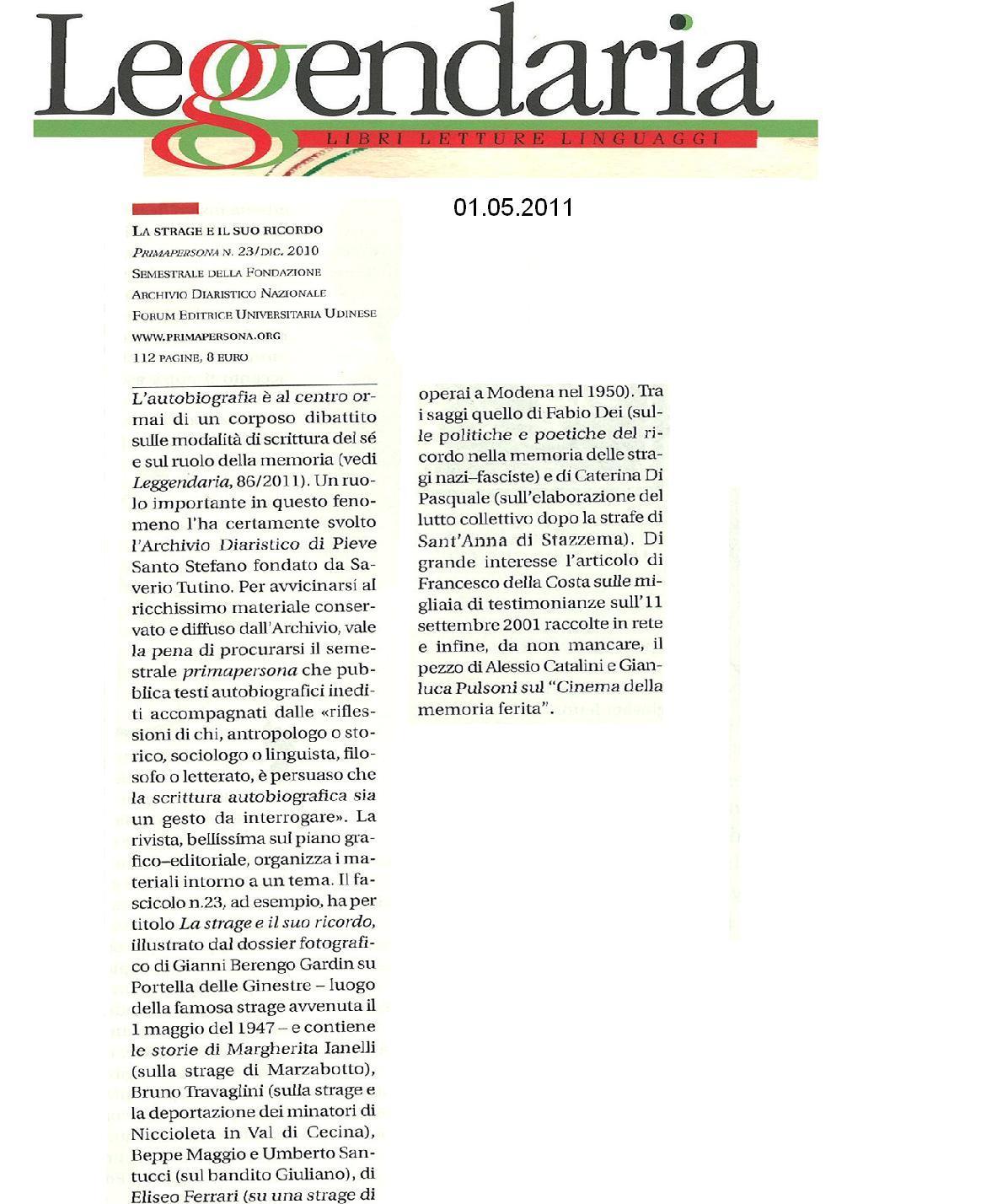 Il numero 23 di «Primapersona» prende le mosse dal dossier fotografico su Portella della Ginestra, luogo del celeberrimo eccidio, concesso in esclusiva alla rivista da Gianni Berengo Gardin e pubblicato nell’inserto centrale: un’istanza morale e civile, dunque, anima le pagine di questo numero che si divide tra l’omaggio alle vittime e la rivendicazione della verità sulle troppe stragi italiane. Ogni strage, come nel modello biblico, è una strage di innocenti, sopraffatti inermi da un nemico più grande, in una disparità di forze disumana. Tra i testi autobiografici, molte sono le memorie di stragi del passato, quelle nazifasciste, perché deve passare il tempo necessario per rievocare traumi così dolorosi; eppure ricordare si deve, anche le tragedie più recenti, come quelle degli anni di piombo, quella di Ustica o quella, solo geograficamente più lontana, dell’11 settembre. Ancora una volta la memoria si impone come testimonianza di ciò che è stato e domanda stringente: perché è stato?