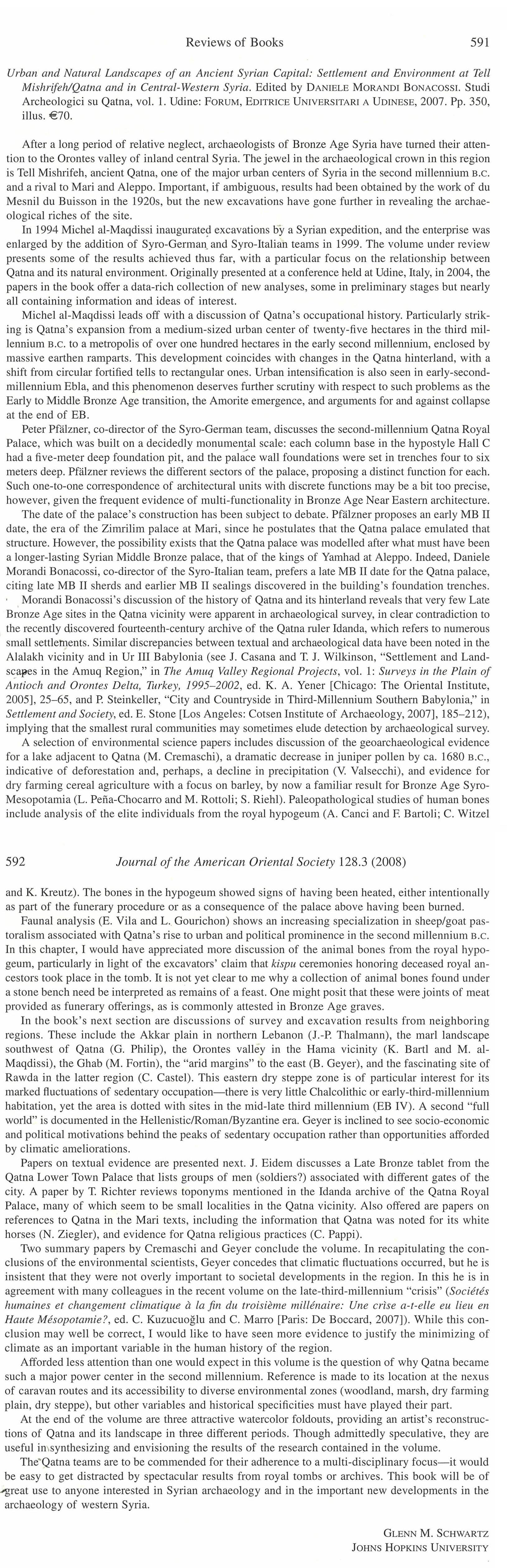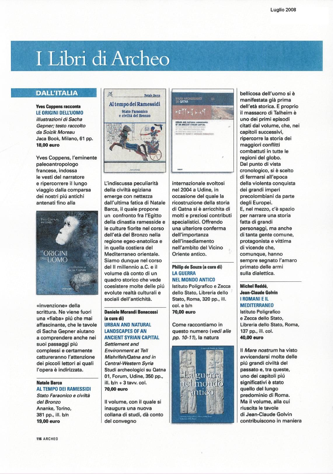 La pubblicazione presenta i risultati di un progetto di ricerca archeologica interdisciplinare siro-italo-tedesco, dedicato alla ricostruzione del paesaggio urbano e dell’ambiente naturale antico di Tell Mishrifeh, l’antica Qatna, durante le età del Bronzo e del Ferro (III e I millennio a.C.). Archeologi, epigrafisti e studiosi di scienze naturali (geoarcheologia, archeobotanica, archeozoologia, antropologia fisica, biochimica) offrono, in una serie di contributi in inglese e francese, tutti preceduti da abstract in lingua araba, una panoramica completa delle più recenti scoperte archeologiche effettuate a Mishrifeh e nel suo territorio a partire dal 1999.