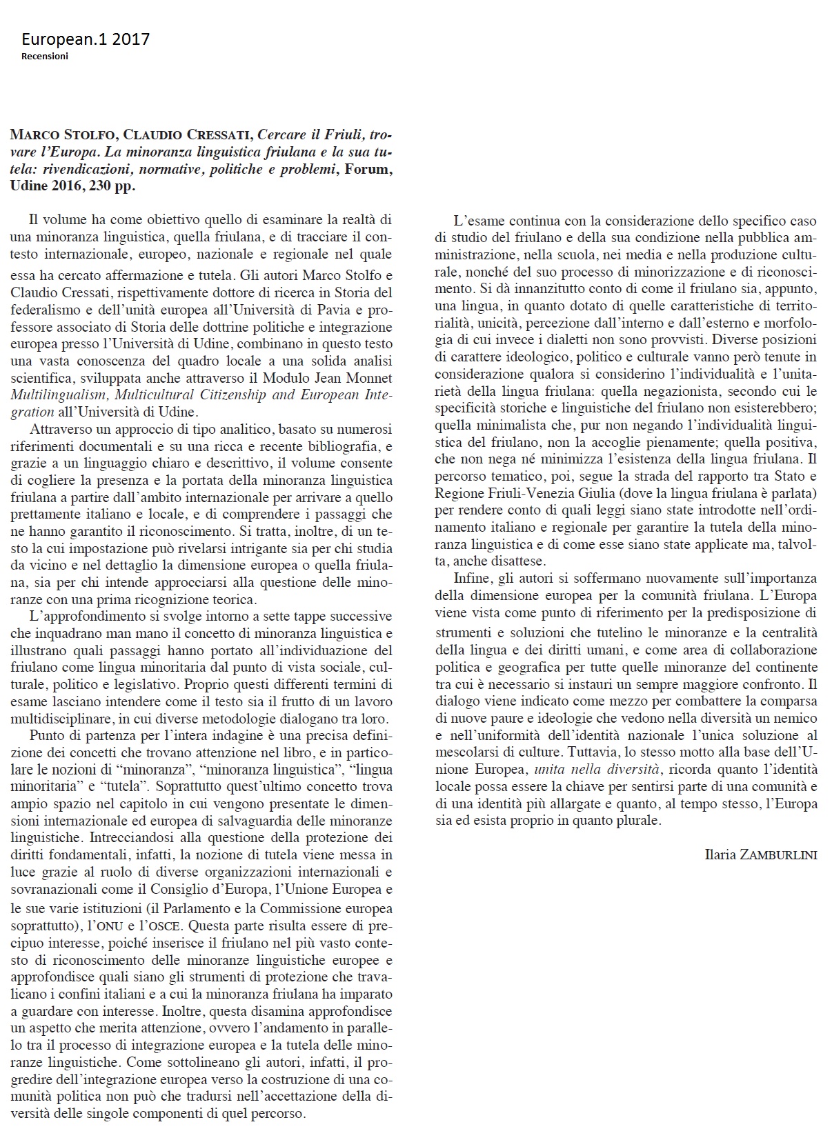 Nel contesto delle minoranze linguistiche in Italia e in Europa quella friulana rappresenta, da più punti di vista, un caso esemplare. Il volume si propone di presentare, nei suoi tratti salienti, la realtà della comunità friulana e della sua lingua, definire il quadro teorico e normativo di riferimento per la sua tutela e affrontare i risultati, i problemi, le opportunità e le prospettive di sviluppo di oltre vent’anni di iniziative realizzate (o quanto meno avviate) da istituzioni pubbliche e private in questo campo. In tale ambito emerge la rilevanza della relazione tra Friuli ed Europa. Per la comunità friulana, infatti, la dimensione europea costituisce un punto di riferimento sia per le sue istanze di riconoscimento e tutela sia per l’elaborazione di soluzioni adeguate e strumenti idonei per rispondere a esse. Il lavoro illustra i principali risultati del progetto di ricerca Looking for Friuli, finding Europe. Self-government, linguistic rights and development between visions, claims and policies, sviluppato dal 2013 al 2016 nell’ambito del Modulo Jean Monnet Multilingualism, Multicultural Citizenship and European Integration dell’Università degli studi di Udine.