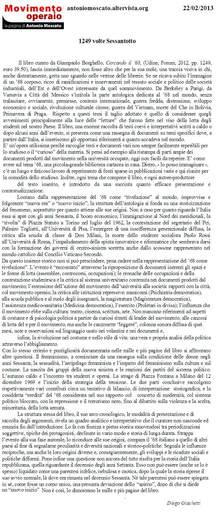 Il ’68 è un tema, quasi paradossalmente, sempre attuale. Coinvolge chi c’era ed è rimasto dalla stessa parte, chi lo ha guardato da lontano con curiosità o con fastidio, chi lo ha attraversato e ora lo rimuove o lo rifiuta, ma anche chi non era ancora nato o all’epoca andava all’asilo ed è desideroso di avvicinarsi, di conoscere, di capire, di giudicare. Questa ampia e rigorosa antologia allinea e accosta analisi e interpretazioni del fenomeno, disegni del contesto italiano e internazionale, documenti della rivolta universitaria, dibattiti sull’‘eredità’ del ’68 e, al contempo, presta particolare attenzione ai ‘luoghi’ (le aule, l’assemblea, il corteo, le occupazioni), al modo di vestire, alle canzoni. Ne risulta un affresco vasto e composito che restituisce efficacemente linee, particolari, colori, atmosfere, contraddizioni di questa mitica e lontana stagione.