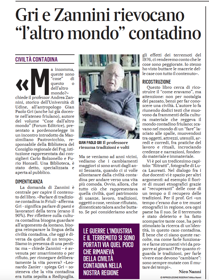 Il volume riunisce dodici testi che muovono da frammenti della cultura materiale che reggeva il mondo contadino friulano, travolto da un sisma più distruttivo del terremoto di quasi mezzo secolo fa. Scavano nel mondo di un fare lasciato alle spalle, muovendosi tra oggetti, attrezzi, utensili, arredi e corredi. Erano più che oggetti, in realtà; erano cose. Fra pratiche del lavoro e rituali, incrociando credenze e narrazioni, fondevano materiale e immateriale, stavano a cuore, dense di saperi, significati, relazioni e memorie. A tenerle oggi di nuovo in mano o ad averle sotto gli occhi (il tredicesimo capitolo: Ritratti, di Luca Laureati) interrogano, chiedono attenzione e cura. L’ altro mondo è dunque quello della cultura popolare e contadina che anche il Friuli ha trovato comodo abbandonare nel corso del Novecento, con scarsa consapevolezza delle conseguenze. Una frattura secca, un mondo fattosi distante e una lingua divenuta bisognosa di traduzione.