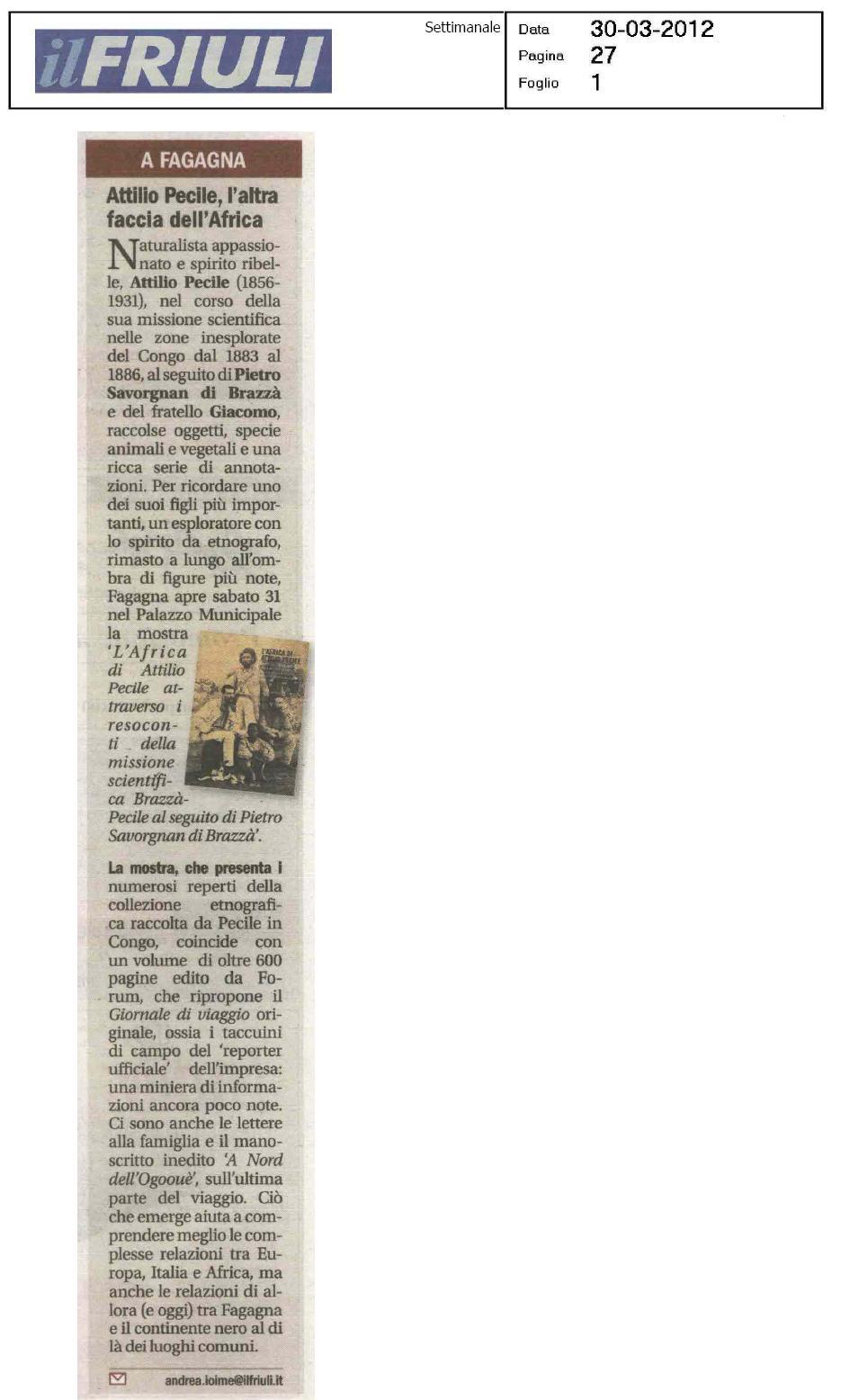 Naturalista appassionato e spirito ribelle, Attilio Pecile (1856-1931), nel corso della sua missione esplorativa in Congo raccoglie, assieme a Giacomo di Brazzà, una ricca e interessante serie di annotazioni: descrive i paesaggi, le popolazioni, le collezioni raccolte e le sue impressioni. Il volume ripropone la riedizione anastatica di parte del libro Al Congo con Brazzà. Viaggi di due esploratori italiani nel carteggio e nel ‘Giornale’ inediti di Attilio Pecile (1883-1886) di Elio Zorzi, edito da Garzanti nel 1940. L’edizione aggiornata presenta un’introduzione di carattere antropologico di Roberta Altin, che rilegge la scrittura diaristica di Pecile attraverso i più aggiornati studi di africanistica. Un secondo contributo di Alessandra Cardelli dà conto della quantità di oggetti riportati in patria al ritorno della missione di esplorazione in Congo e ora nucleo d’importanti collezioni al Museo ‘Pigorini’ di Roma. Stefano Morandini propone, nella terza parte, la trascrizione di un manoscritto inedito rinvenuto nella biblioteca di casa Pecile, prima intenzione di scrittura dell’esploratore friulano. Il volume è corredato da disegni e illustrazioni dal manoscritto originale e da fotografie della spedizione.