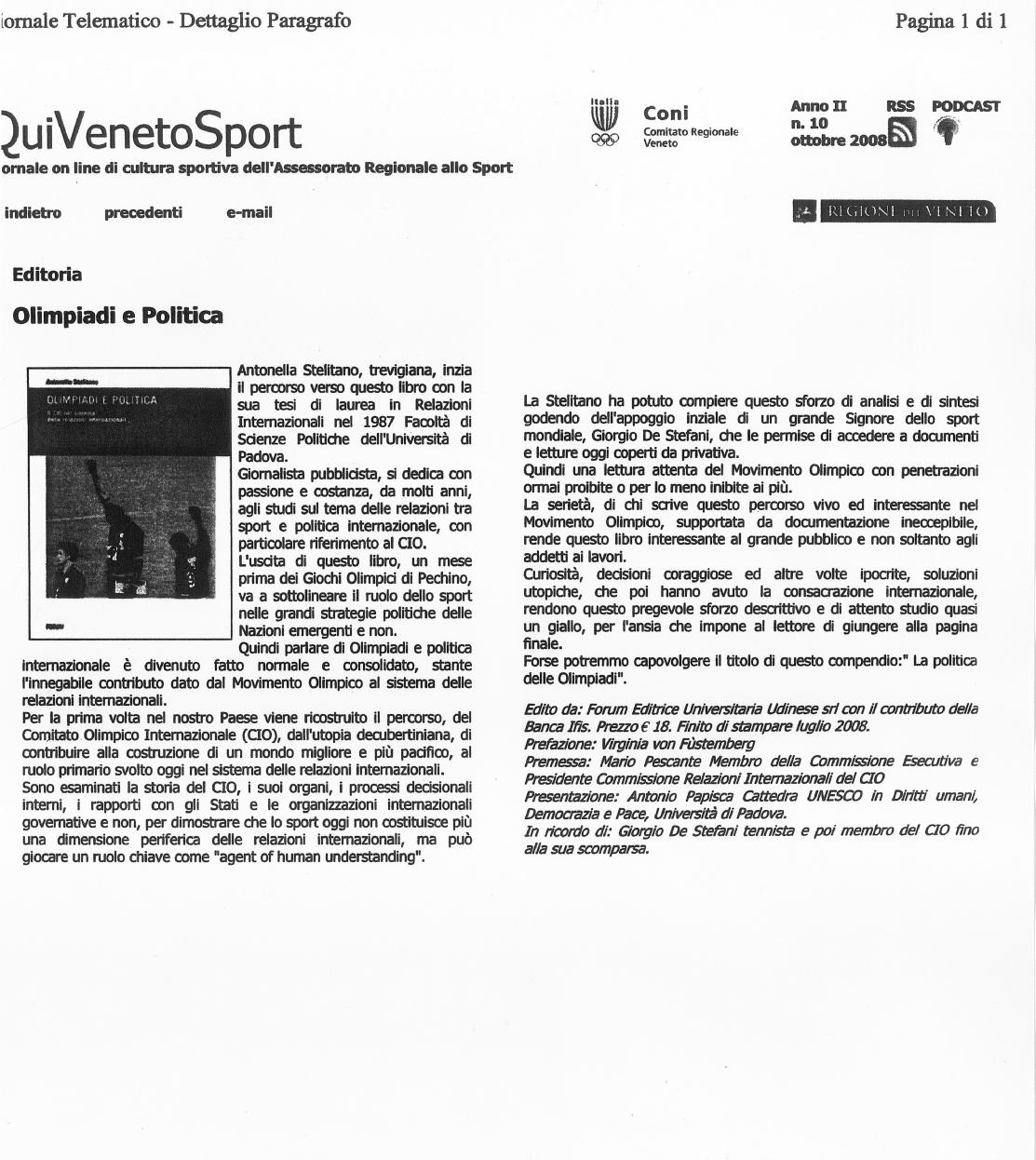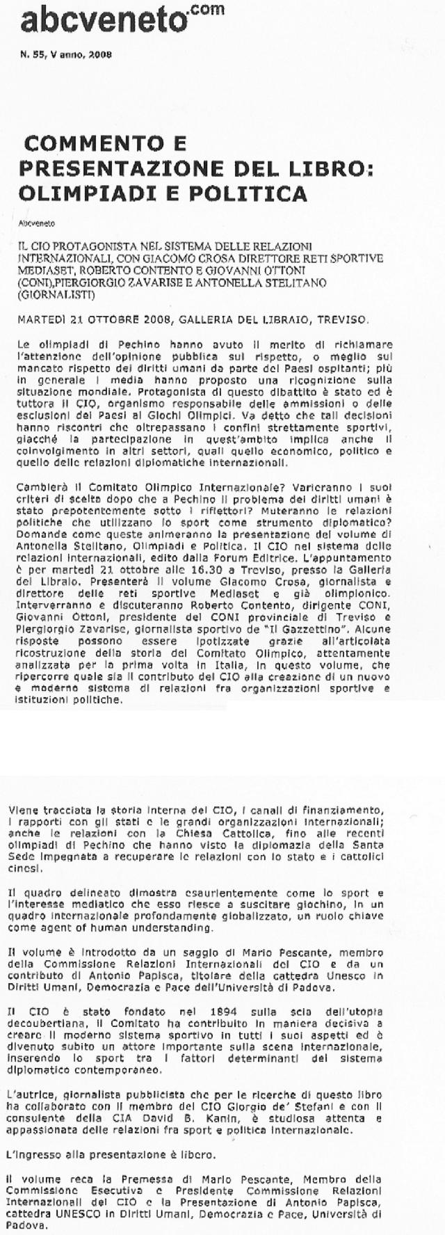 Perché si parla di Olimpiadi e politica internazionale? Quale contributo ha portato il Movimento Olimpico al sistema delle relazioni internazionali? La pubblicazione ricostruisce, per la prima volta in Italia, il cammino del Comitato Olimpico Internazionale (CIO) dall’utopia decoubertiana di contribuire alla creazione di un mondo migliore e più pacifico, al ruolo chiave svolto oggi nel sistema delle relazioni internazionali. Sono esaminati la storia del CIO, i suoi organi, i processi decisionali interni, i rapporti con gli Stati e le organizzazioni internazionali governative e non, per dimostrare che lo sport oggi non costituisce più una dimensione periferica delle relazioni internazionali, ma può giocare un ruolo chiave come agent of human understanding.