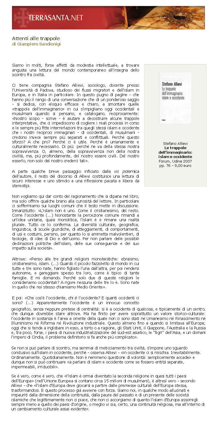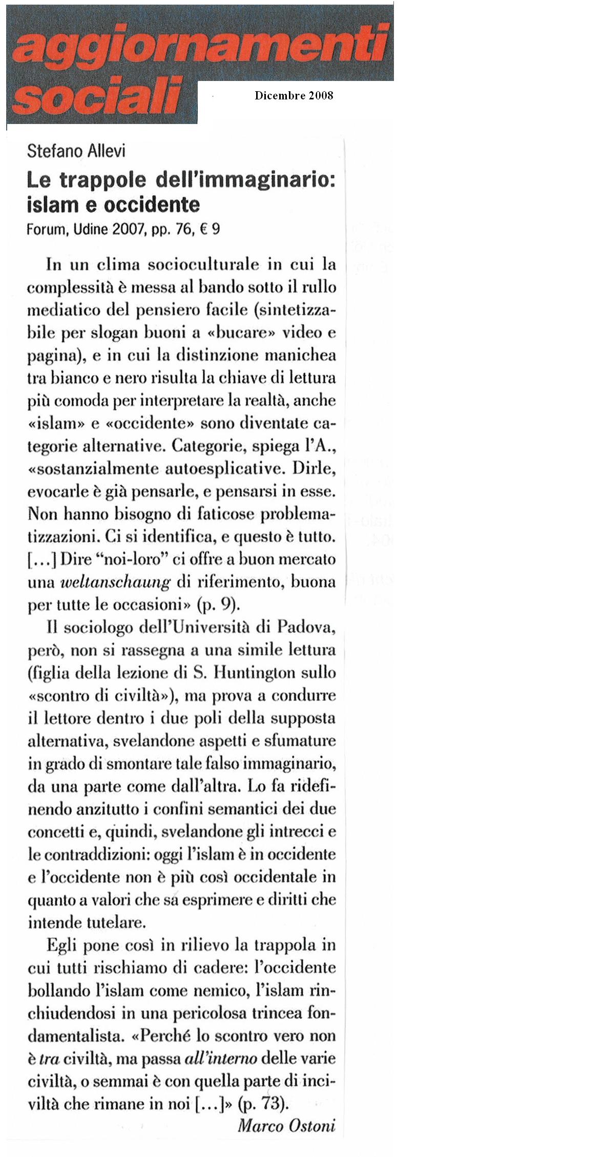 Il volume intende analizzare le radici dell’immaginario reciproco tra Islam e Occidente, la sua storia, e soprattutto approfondire la sua attualità, e il suo uso come oggetto contundente di polemica politica, culturale e religiosa. Lo scopo è di decostruire alcune trappole interpretative, che ci impediscono di cogliere i reali processi in corso, e le sempre più fitte interrelazioni tra quegli stessi Islam e Occidente che il nostro e il loro immaginario credono invece sempre più separati e conflittuali.