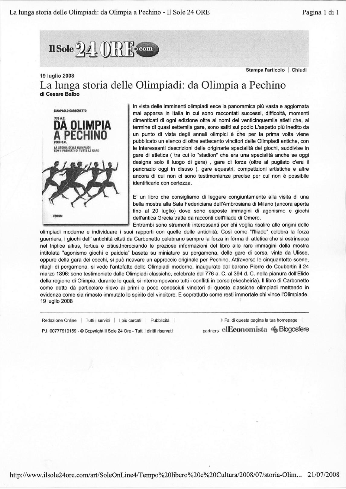 Il Sole24Ore.com | 19.07.2008 | La lunga storia delle Olimpiadi: da Olimpia a Pechino | Cesare Balbo |