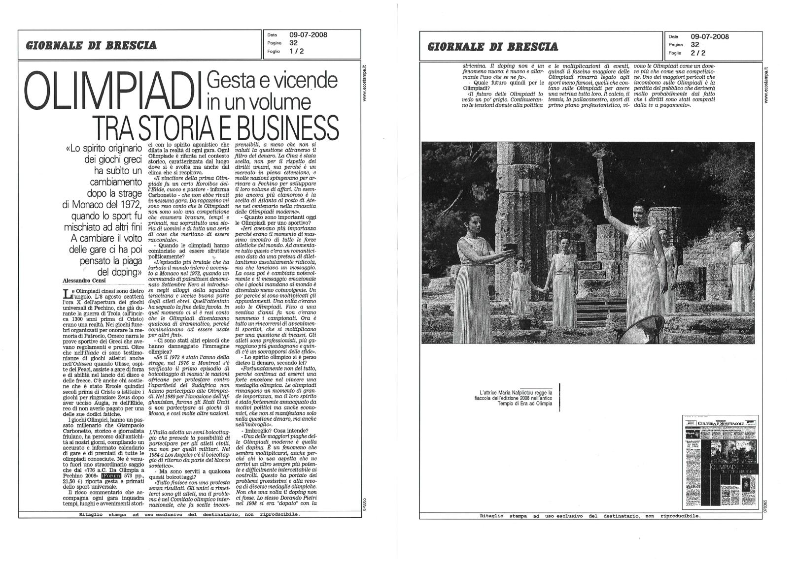 Giornale di Brescia | 09.07.2008 | Olimpiadi gesta e vicende in un volume tra storia e business | Alessandro Censi |