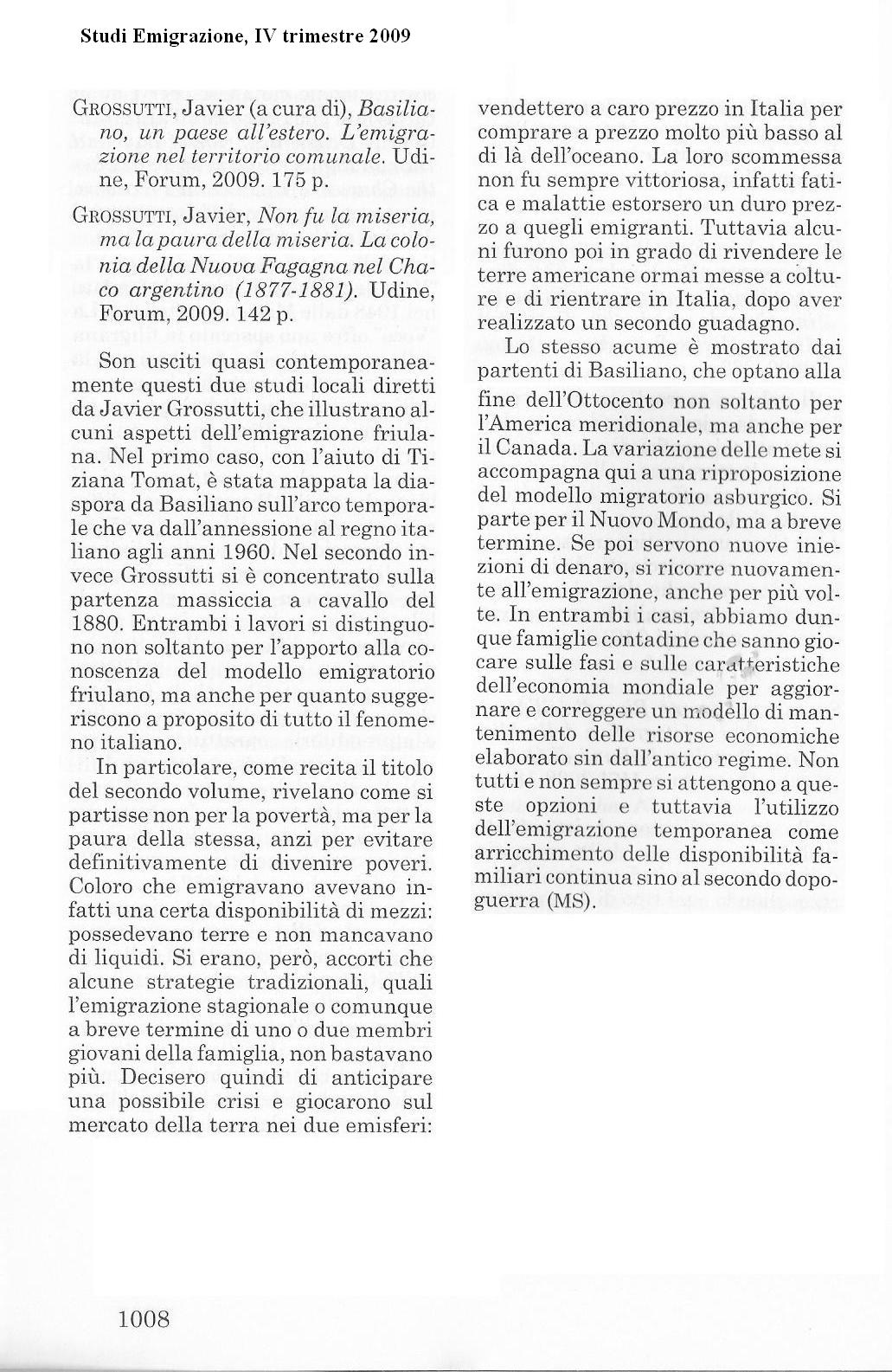 Studi Emigrazione | 01.12.2009 | Grossutti, Non fu la miseria, ma la paura della miseria |