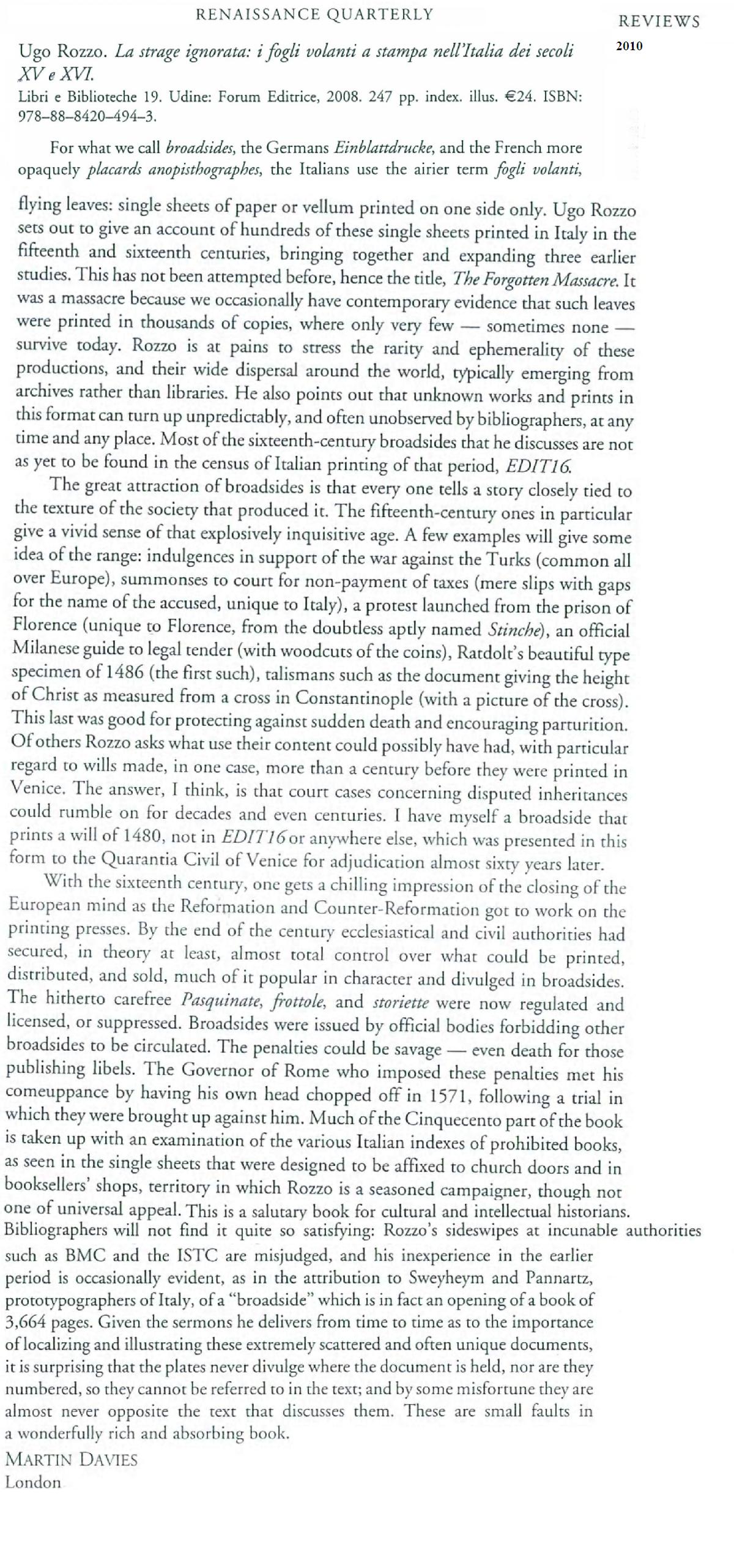 Reinessance Quarterly | 01.10.2009 | La strage ignorata: I fogli volanti a stampa nell'Italia dei secoli XV e XVI | Martin Davies |